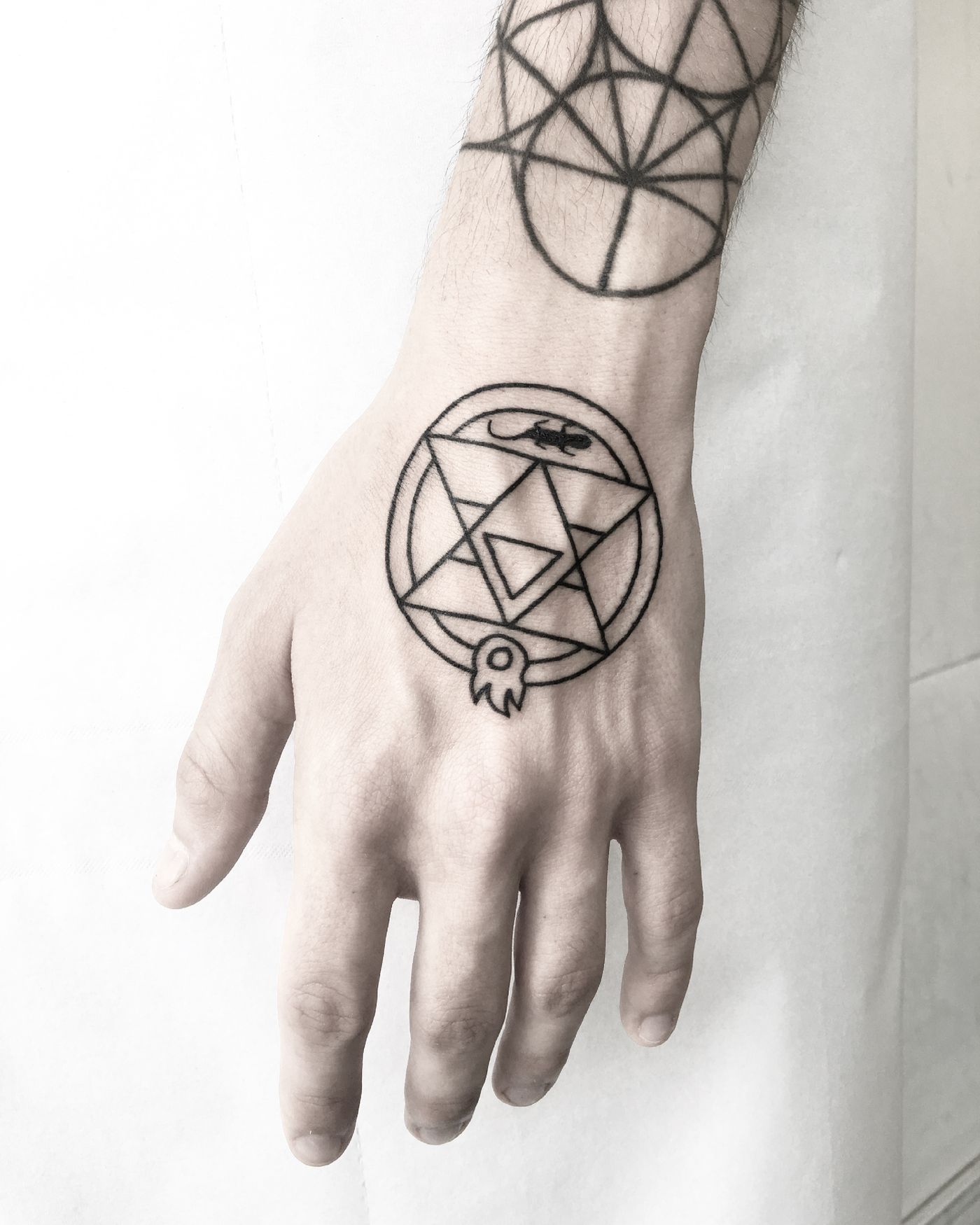 Elegant and intricate fine line geometric tattoo by talented artist Malvina Maria Wisniewska. Perfect blend of art and precision.