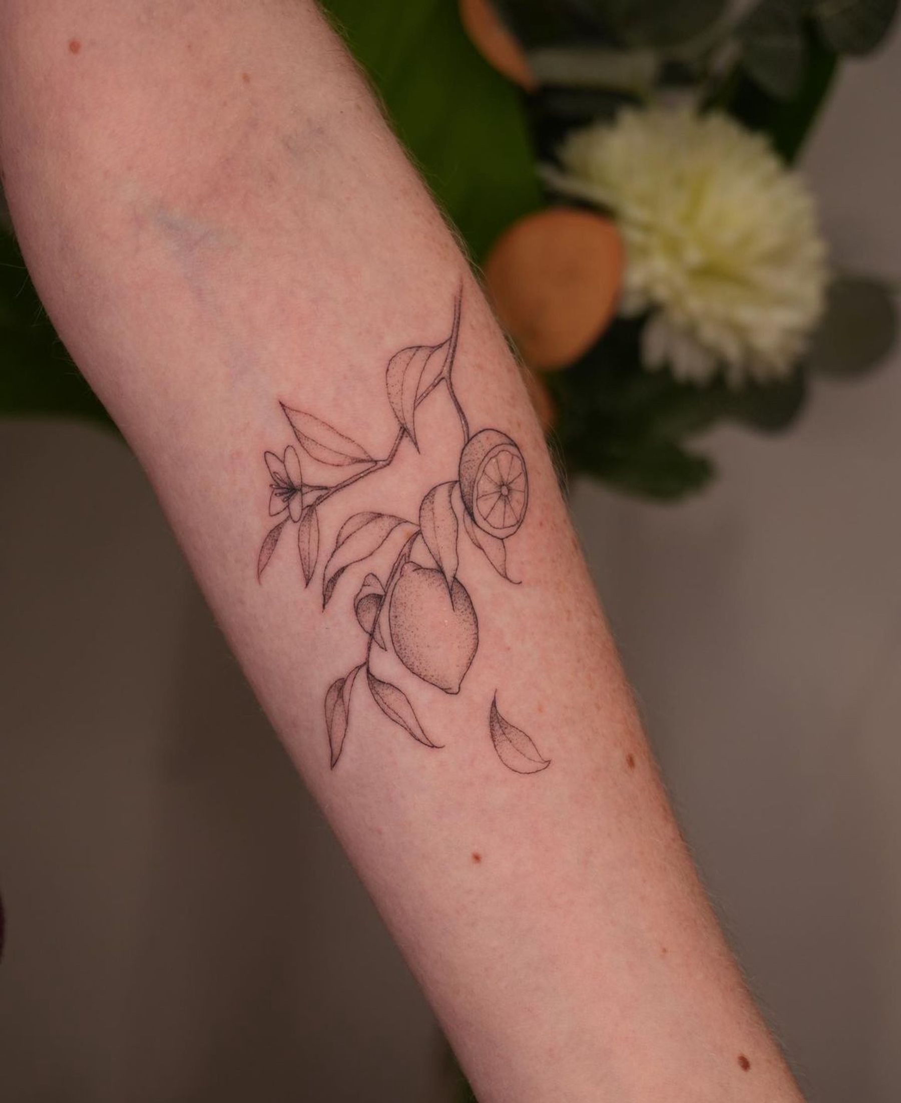 The tattoo depicts a branch with lemons and leaves, with a half-cut lemon. The style is illustrative and delicate, using fine lines and dot shading to create texture. The design has a natural and fresh feel. The composition of the elements has a delicate balance, with a light and airy appearance.