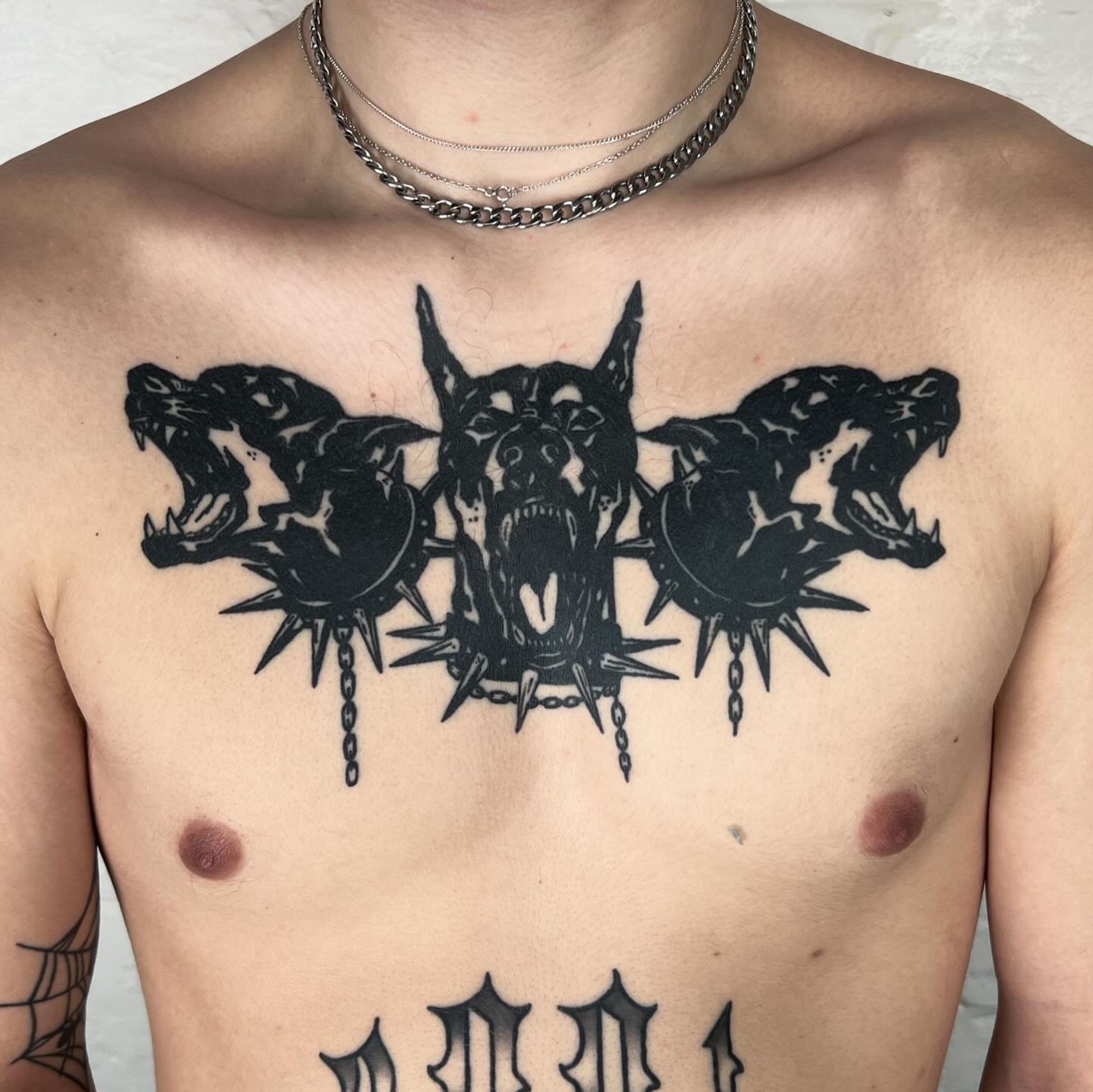 The tattoo features three snarling dog heads, likely Cerberus, in a bold, graphic style. The style is illustrative with a focus on sharp, black lines and details. The overall feel of the tattoo is intense and threatening, emphasized by the spiked collars. The contrast and dynamic poses of the dogs add to the striking visual impact.