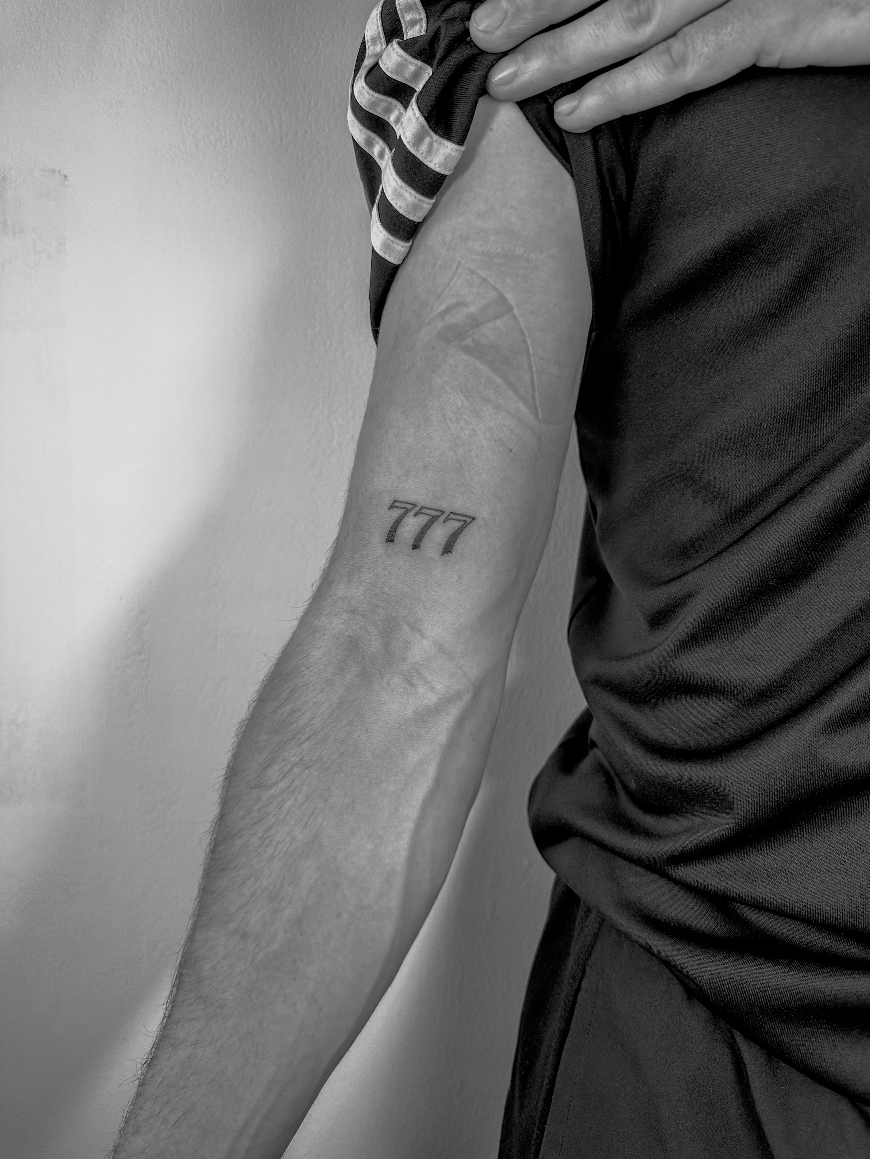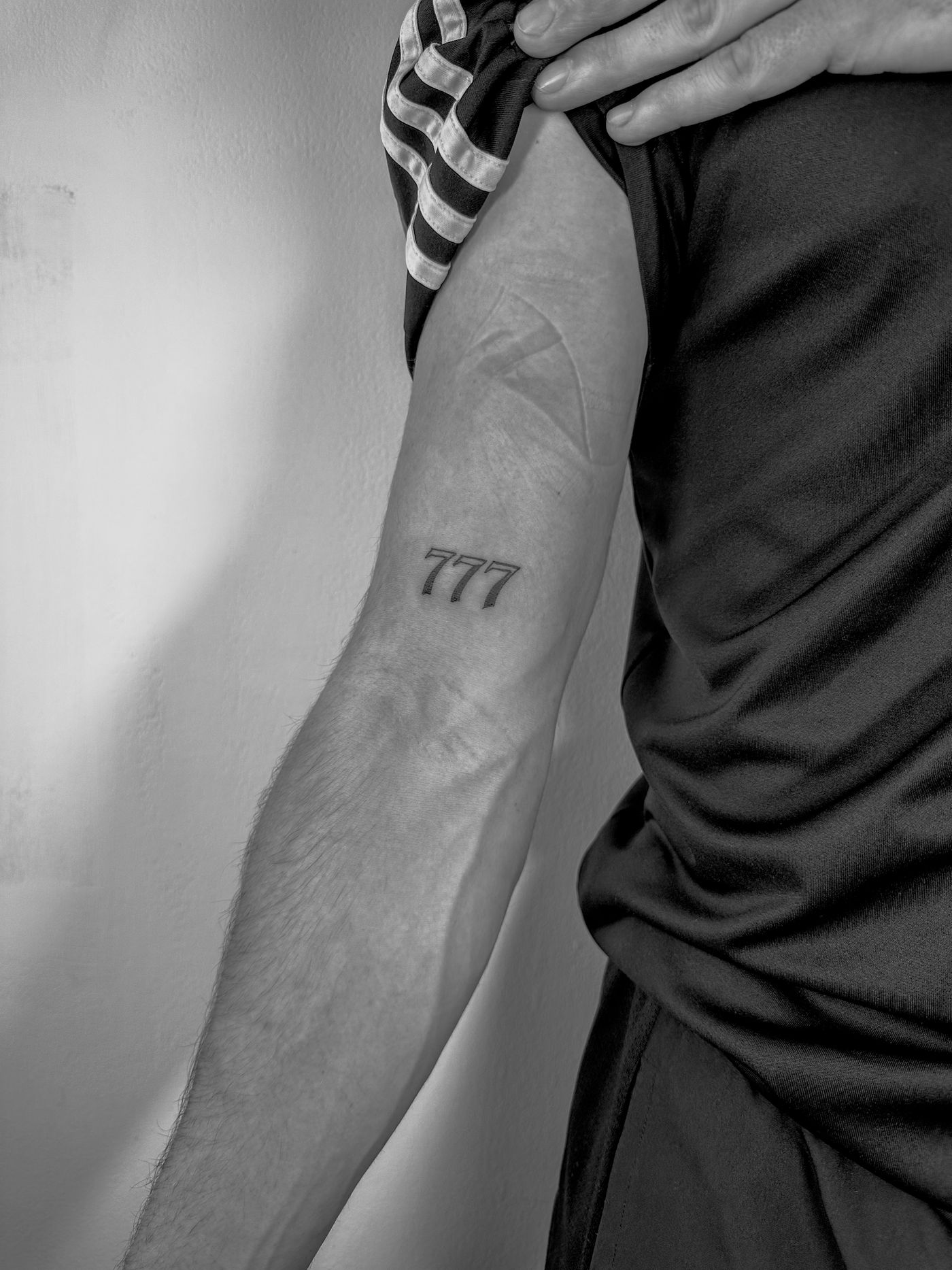 Get a minimalist and stylish number tattoo designed by the talented artist Oliver Soames. Perfect for a meaningful date or lucky number.