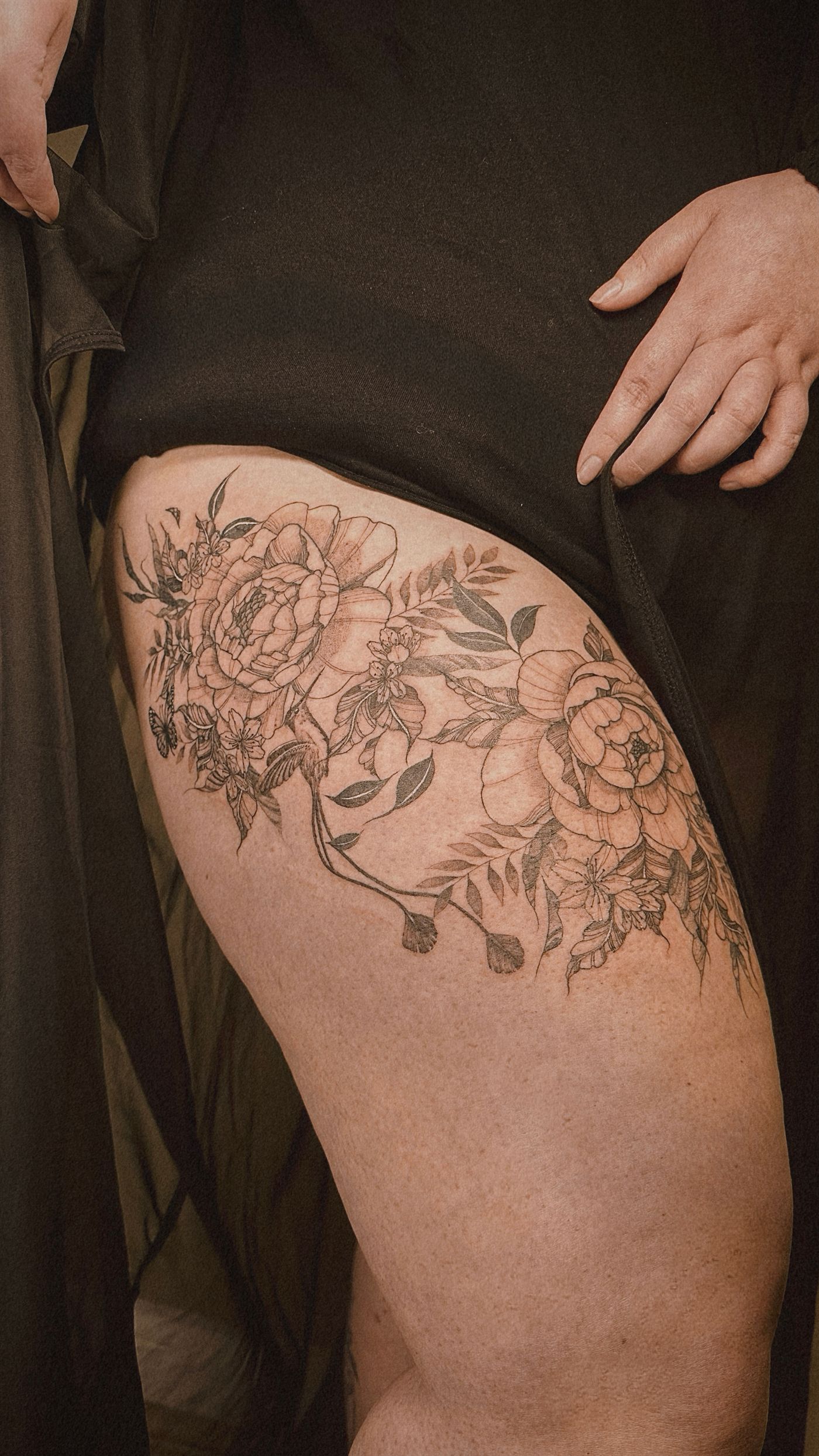 Fine line floral thigh, peonies, cherry blossoms, butterflies and hummingbird