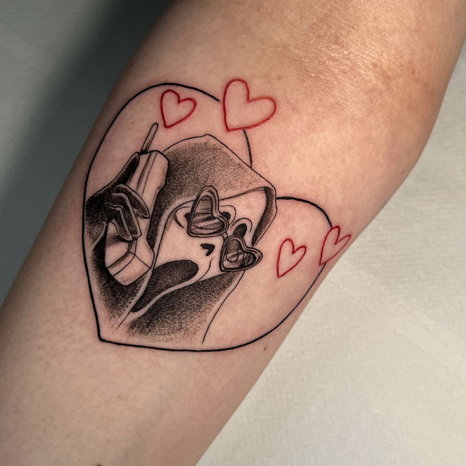 The tattoo is a cartoon-style image of the Ghostface character from the 'Scream' movies holding a phone and wearing heart-shaped glasses, surrounded by hearts. The style is a mix of linework and shading to create a playful and stylized effect.