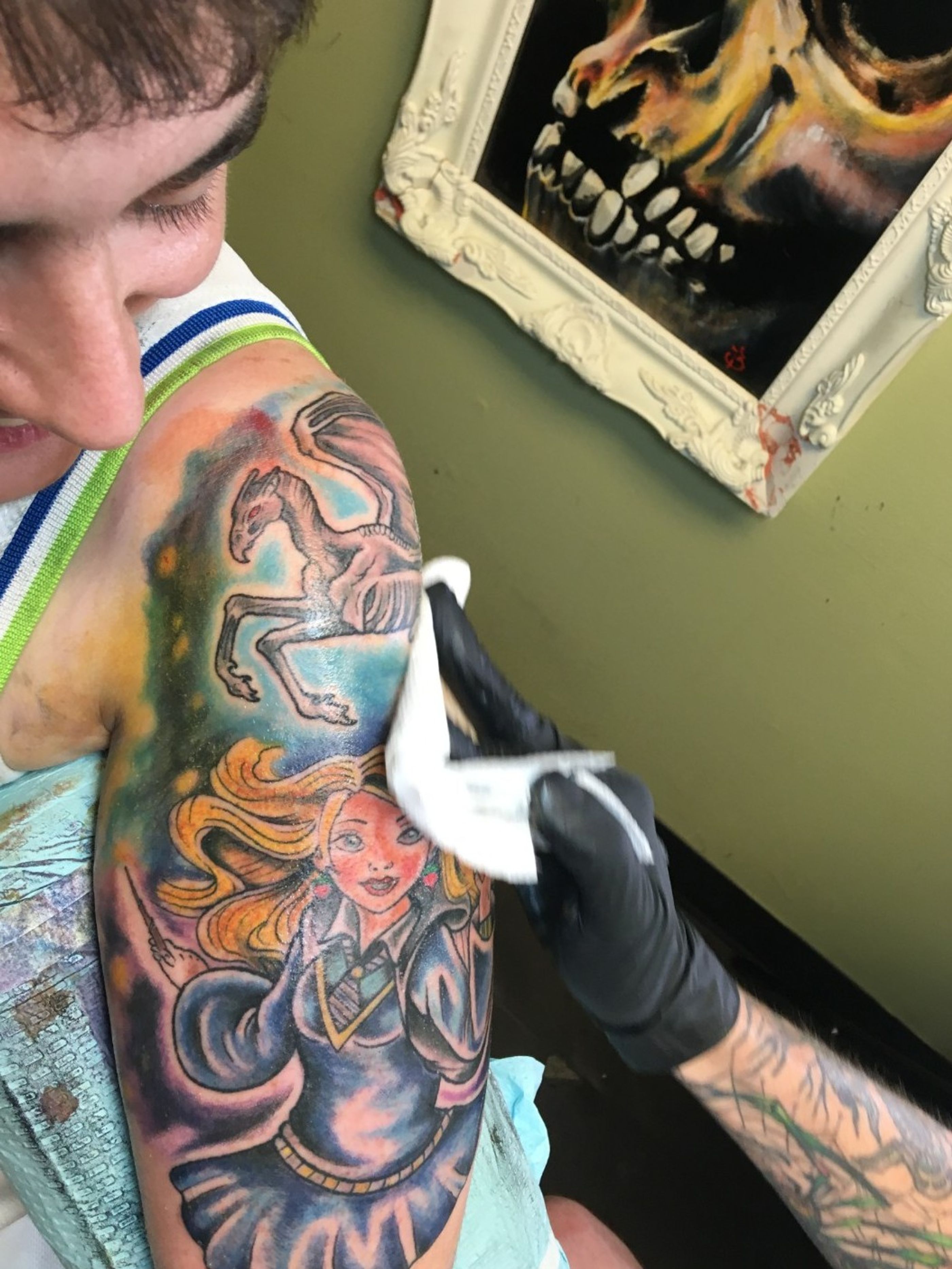 End of session 2 for Luna/Thestral left half-sleeve - July 2018 @ Blu Gorilla Goose Creek, SC by Paul Zapico