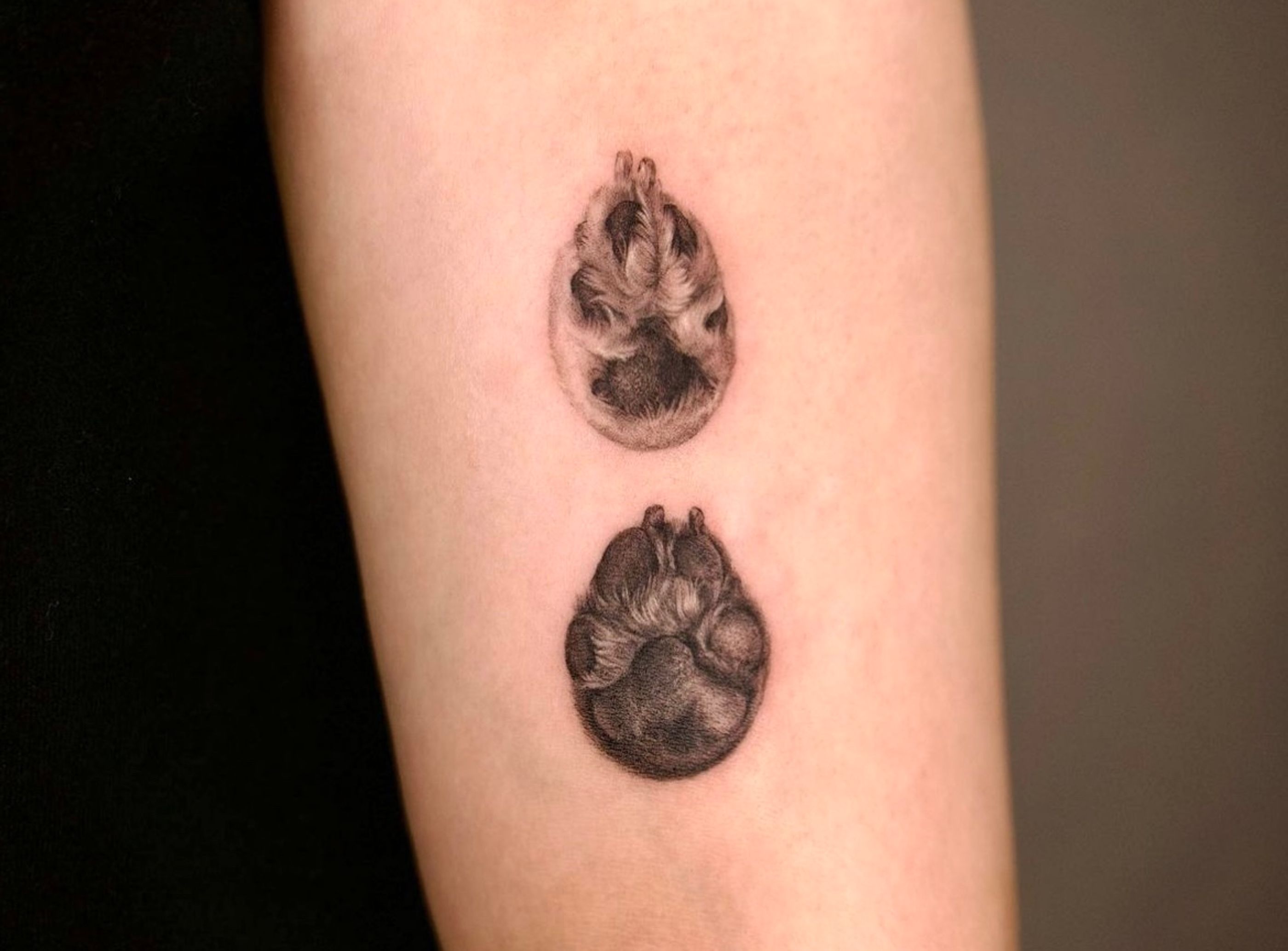 Paw tattoo, dog tattoo, cat tattoo, pet portrait, black and gray, fine line tattoo, paw, paw print, dog paw print