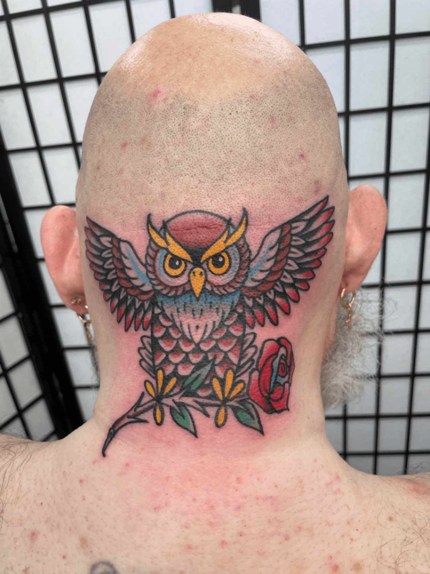 Get a stunning traditional owl tattoo crafted by renowned artist Marc 'Cappi' Caplen. Embrace the wisdom and mystique of the owl with this timeless design.