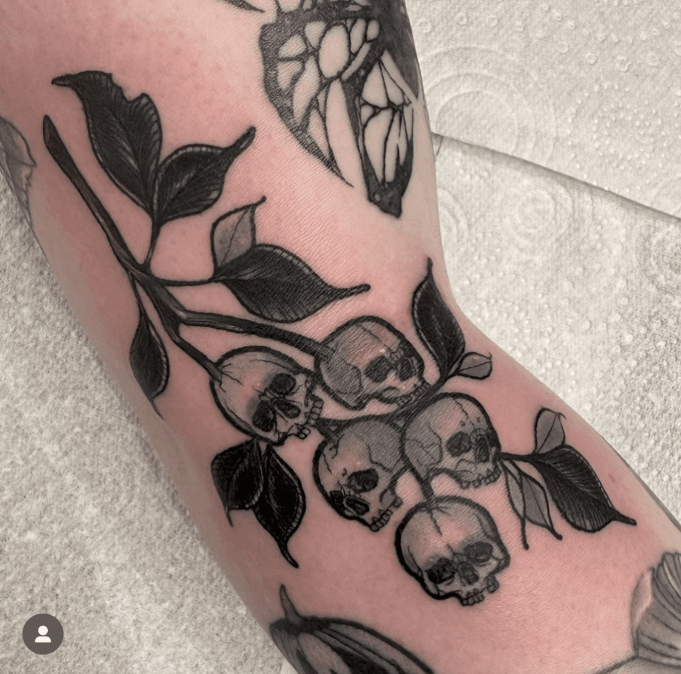 Unique black and gray design blending tree and skull motifs with intricate branch details in a neo-traditional style. Created by the talented artist Katy Sarsfield.