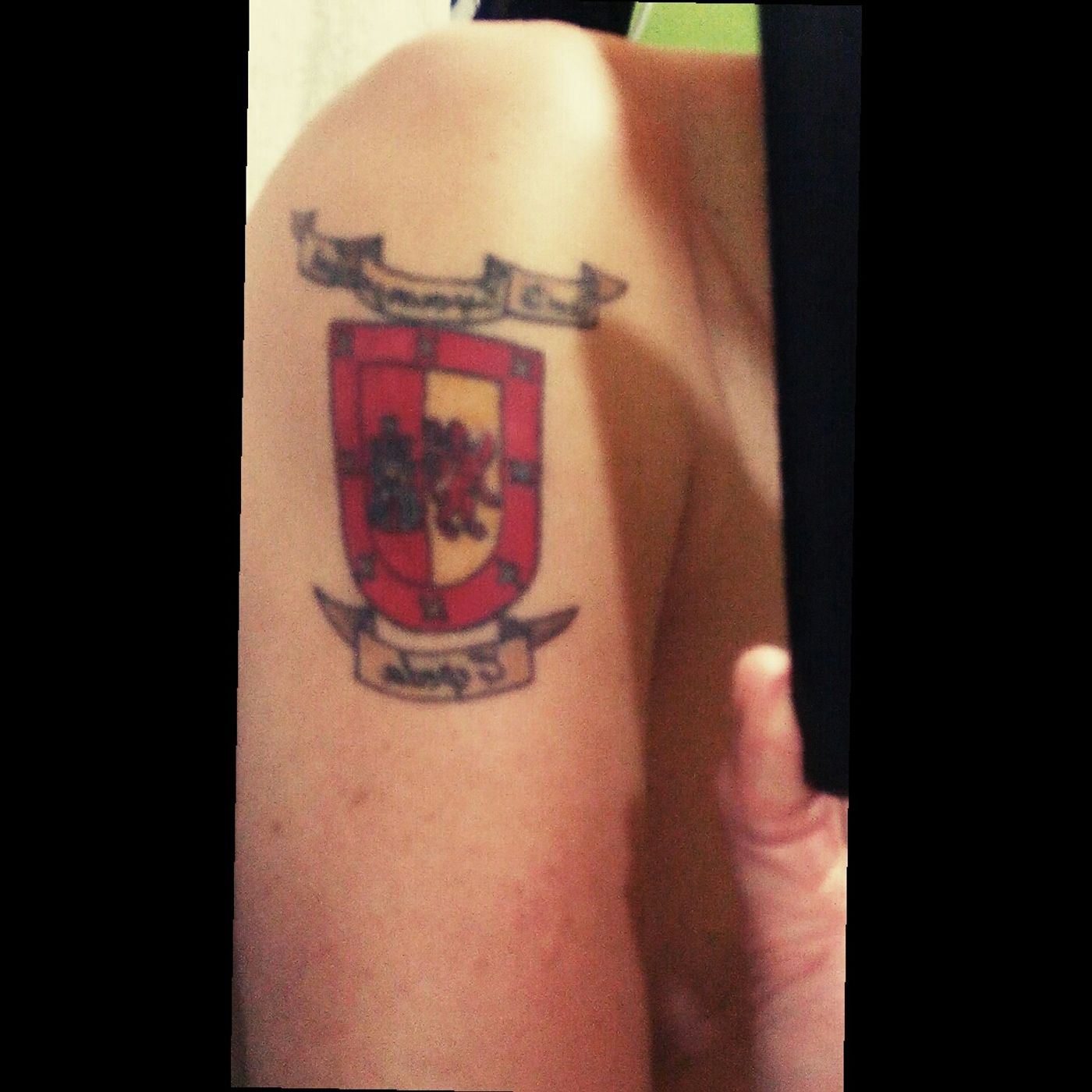 Tatuaje con escudo de mi apellido y el nombre de mis hijos