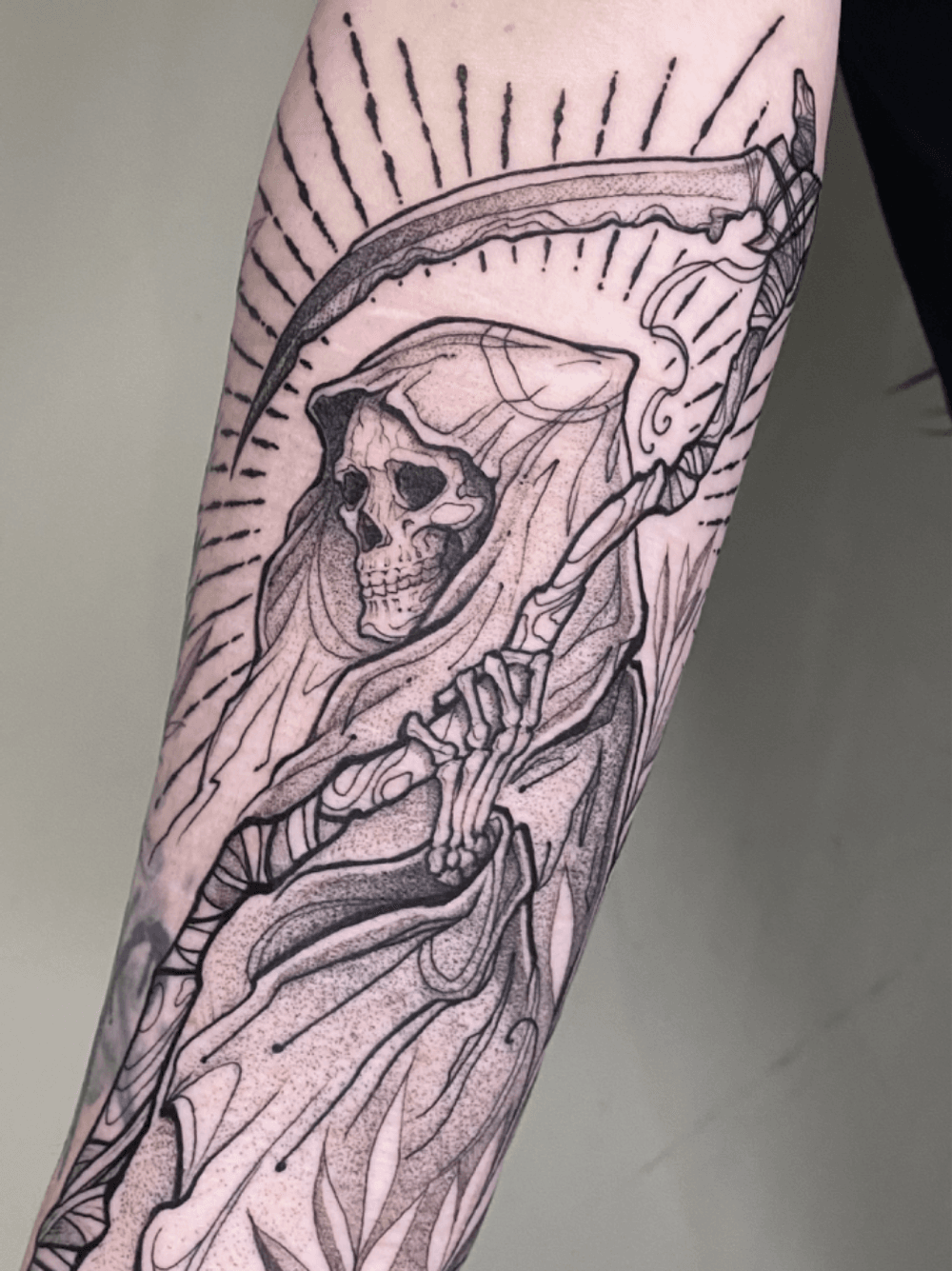 Grim reaper illustrative black work ink design with leaves and stipple shading