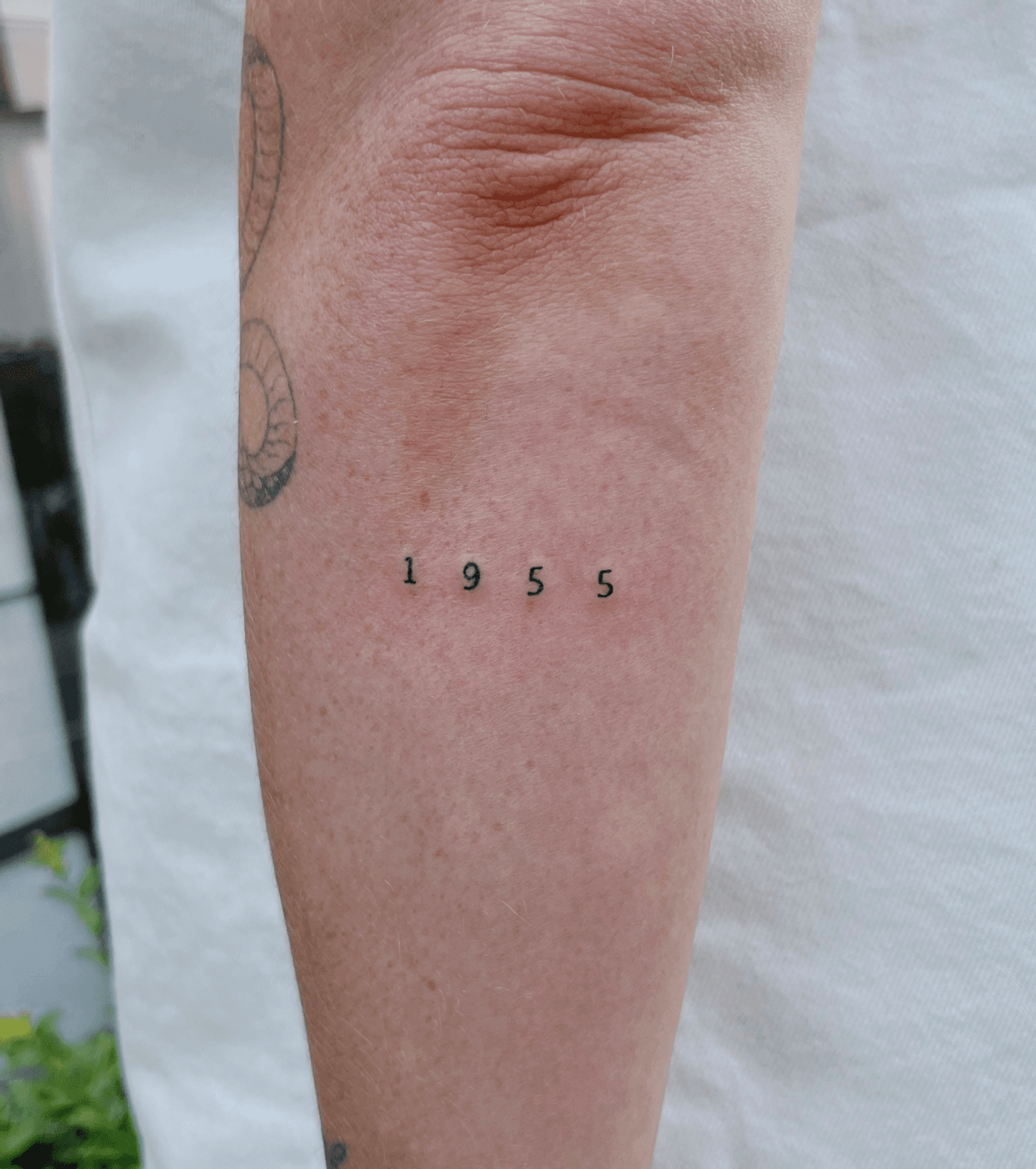 The tattoo consists of the numbers "1955" in a small, simple font. The style is minimalistic, with fine, precise lines, giving it a clean and subtle appearance.