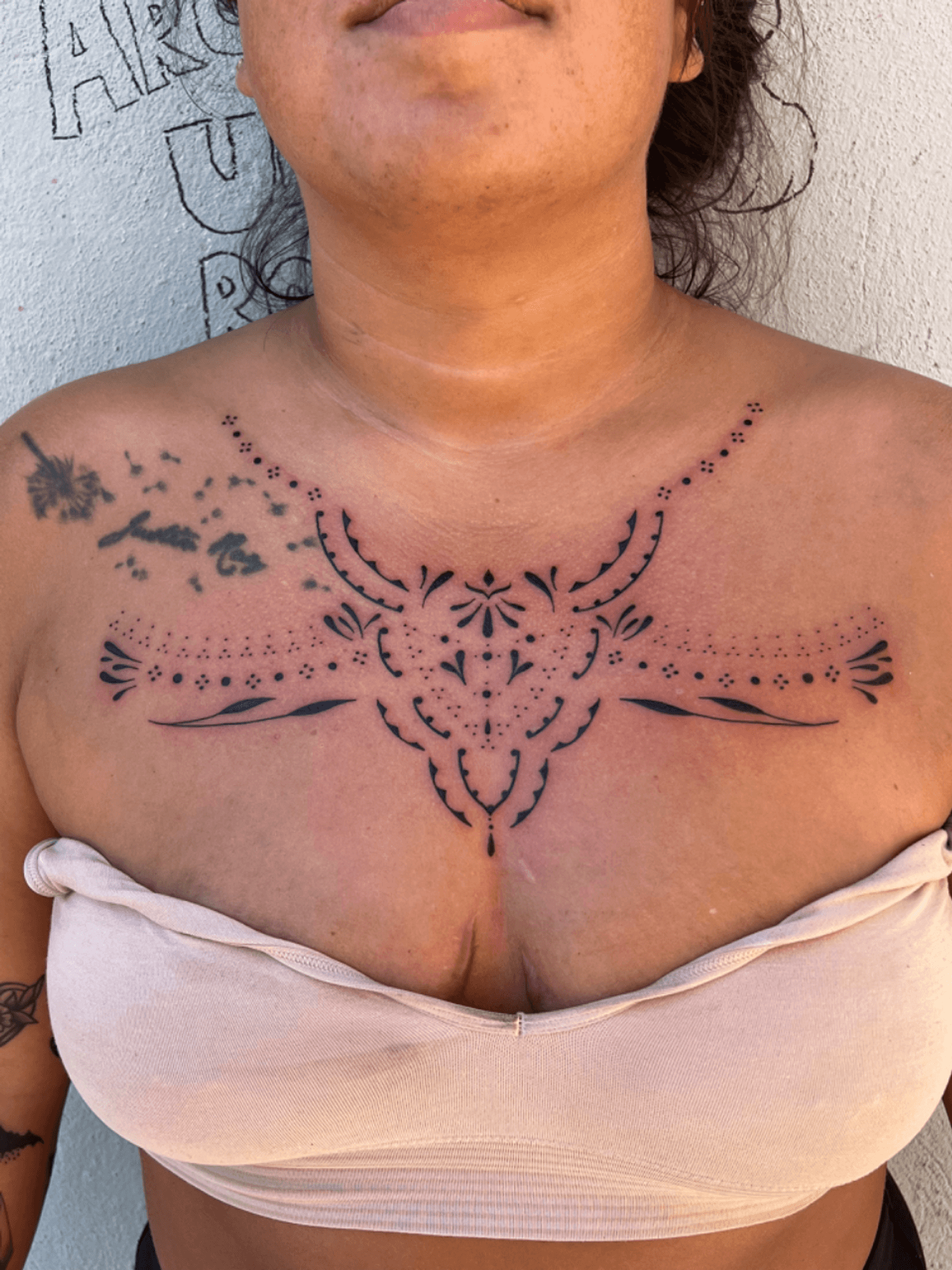 The tattoo is a symmetrical chest piece that features a central, stylized ornamental design. The piece is symmetrical and has fine lines with dot work and a general bohemian feel.