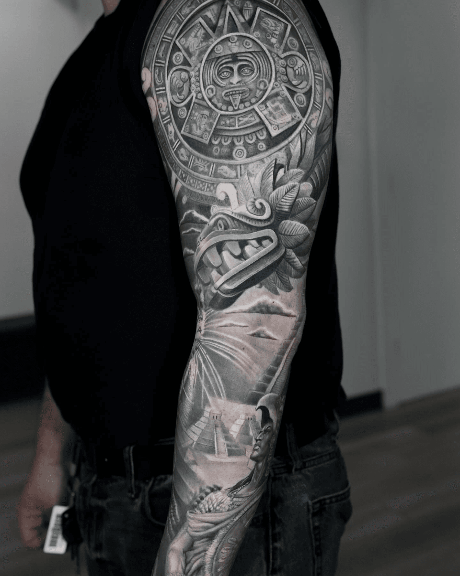 The tattoo is a detailed sleeve design featuring a Mayan calendar, a feathered serpent, a pyramid scene, and a portrait. The style is realistic with shading and attention to detail. The overall feel is cultural and historical.