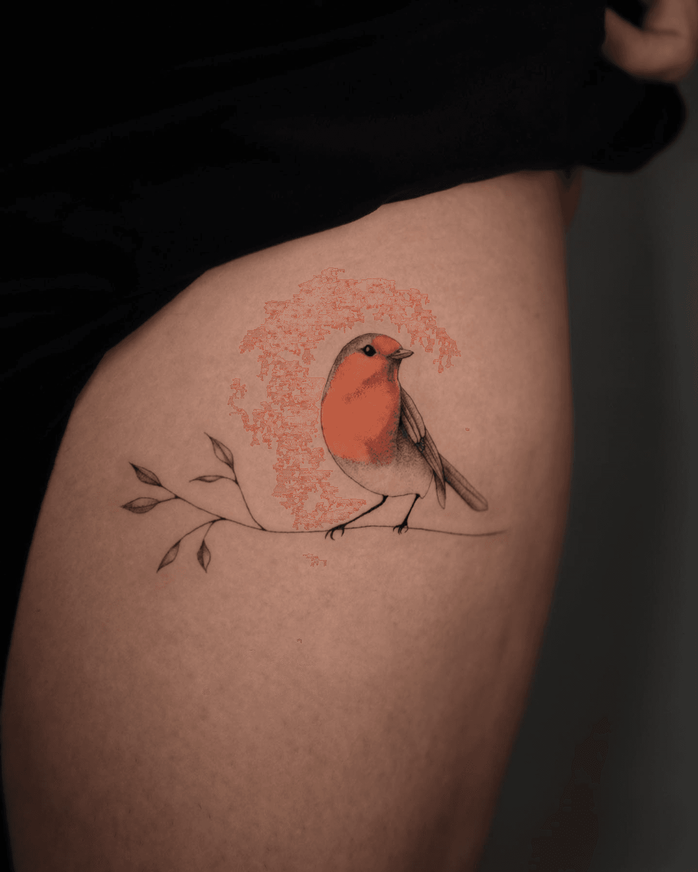 The tattoo displays a robin perched on a branch. The bird is realistically colored, with a red chest and gray wings, using a dot work technique. The branch is rendered with minimalist lines, presenting a balanced, natural composition.