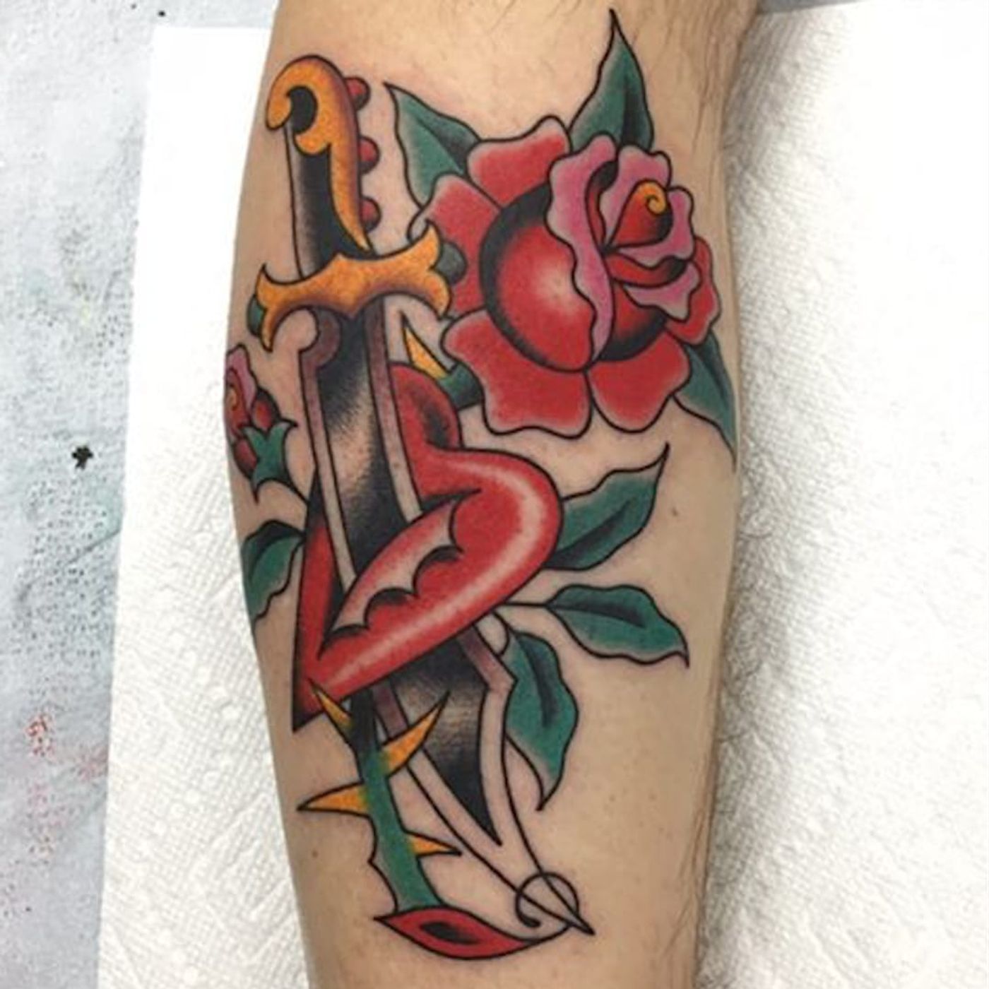 Shot through the heart. #BradStevens #Traditional #bold #heart #flowers #knife #dagger #rose