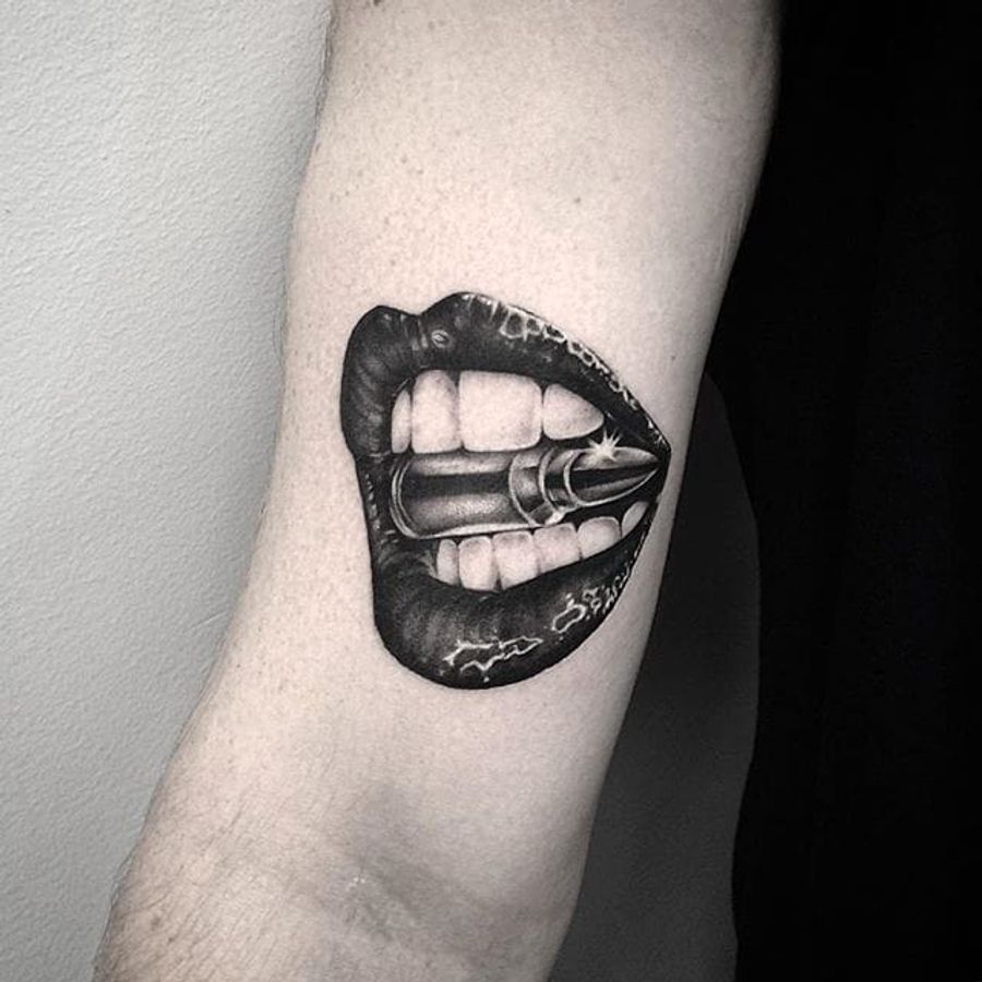 Bite the bullet via lazerliz #blackandgrey #mouth #lips #lipstick #teeth #elizabethmarkov #bangbangnyc #bullet #sexytattoo