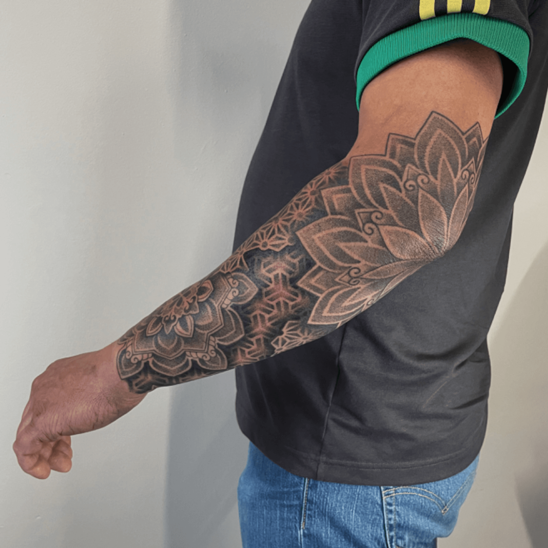 Elbow mandala surrounded by a dotwork geometric half sleeve