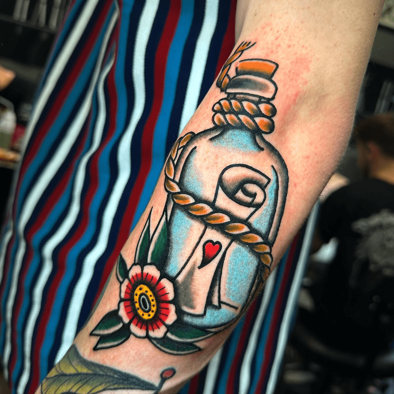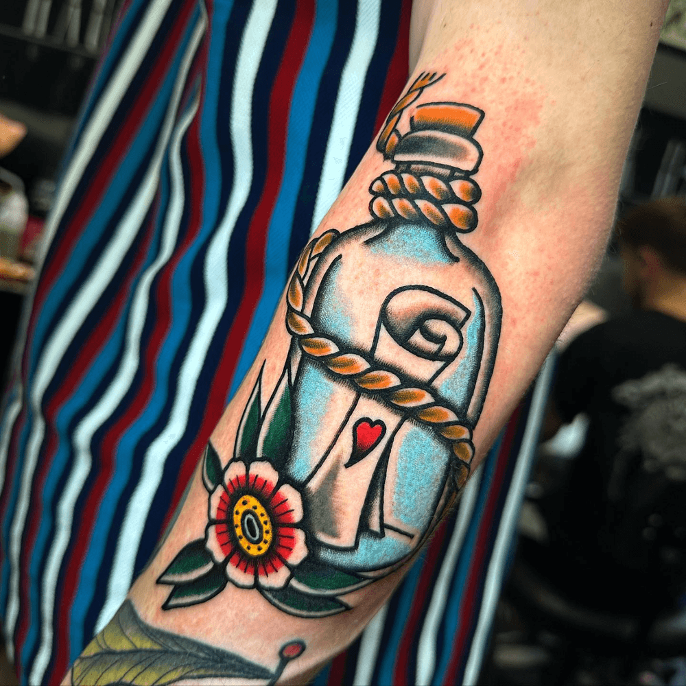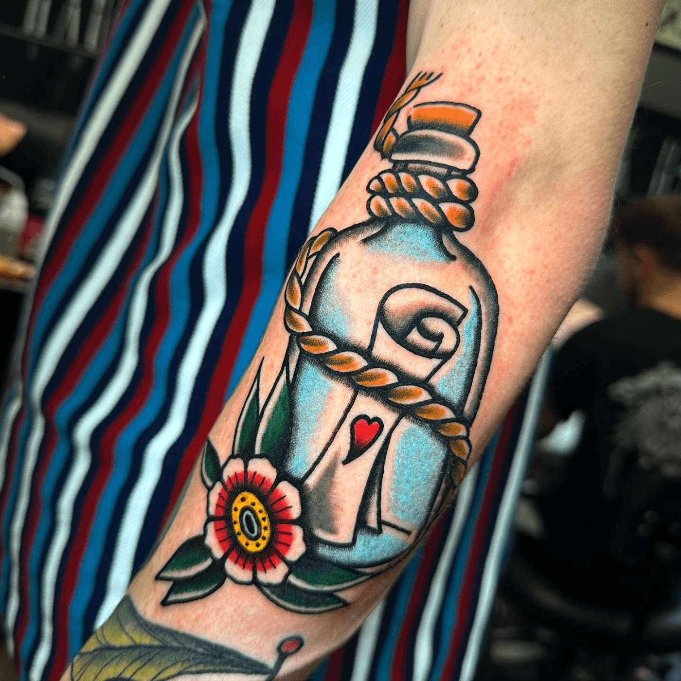 This tattoo is a classic traditional design featuring a bottle with a scroll inside, wrapped in rope and decorated with a red heart and a flower. The style has bold lines and bright colors.