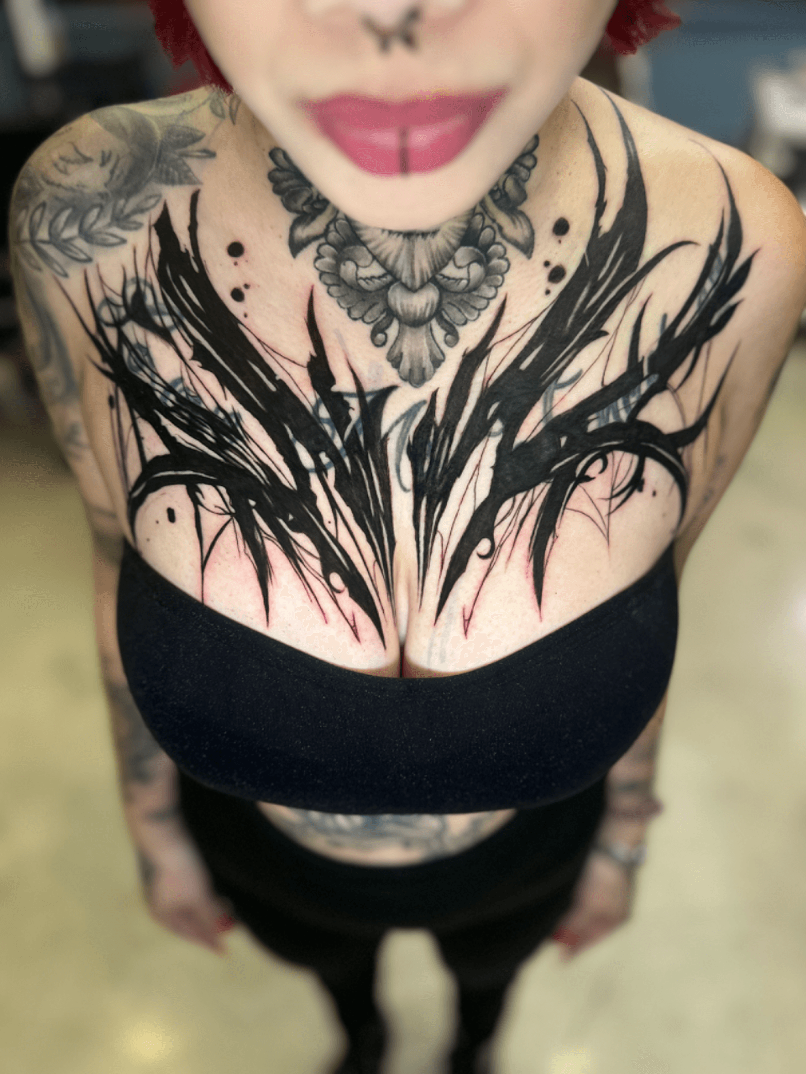A large, abstract tattoo design covering the upper chest. It consists of flowing, jagged black lines and shapes that create a chaotic, dynamic feel. The style is modern and expressive, using a minimal color palette to achieve a striking visual effect.