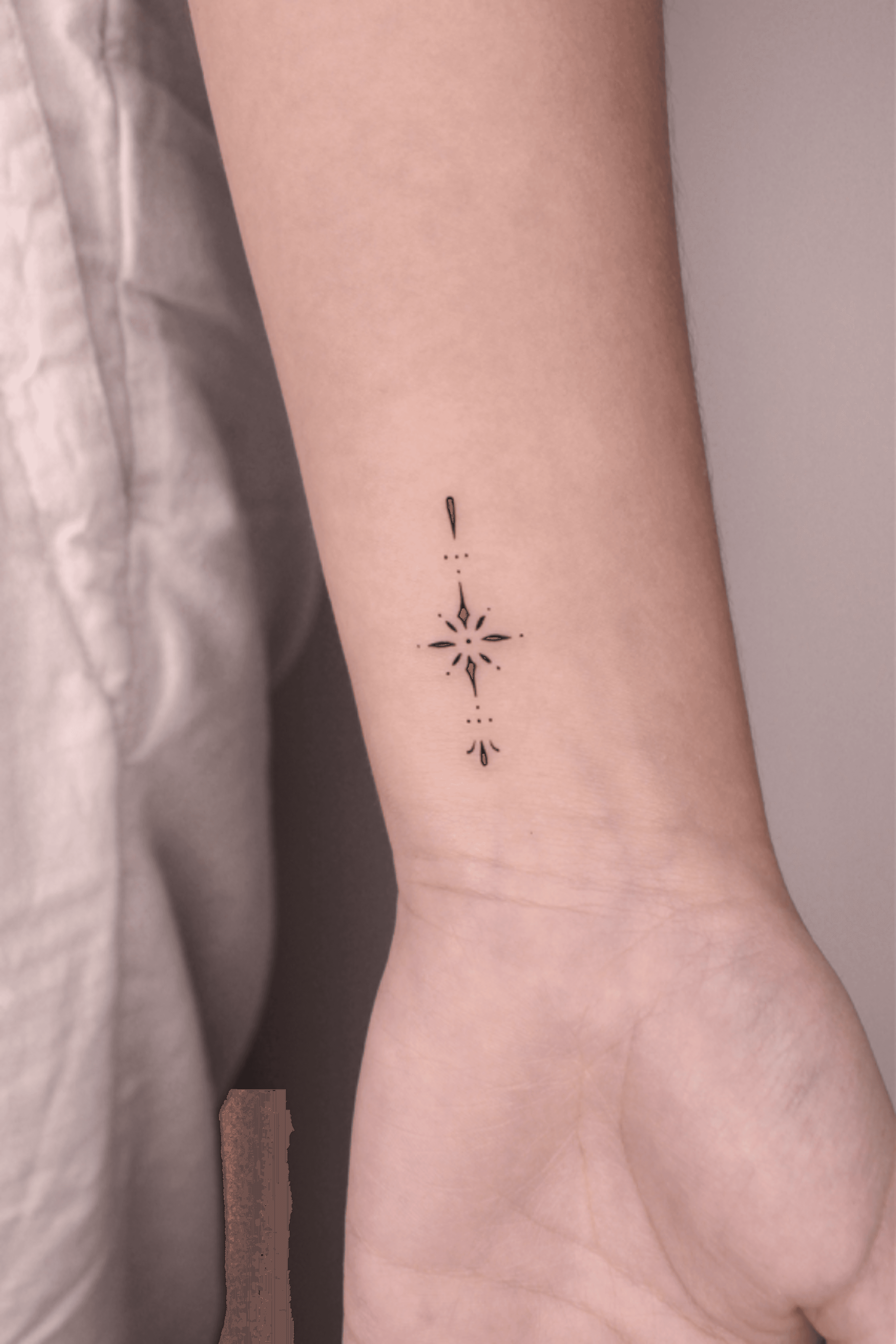 The tattoo features a small star design, with a vertical dotted line. The style of the tattoo is minimal.
