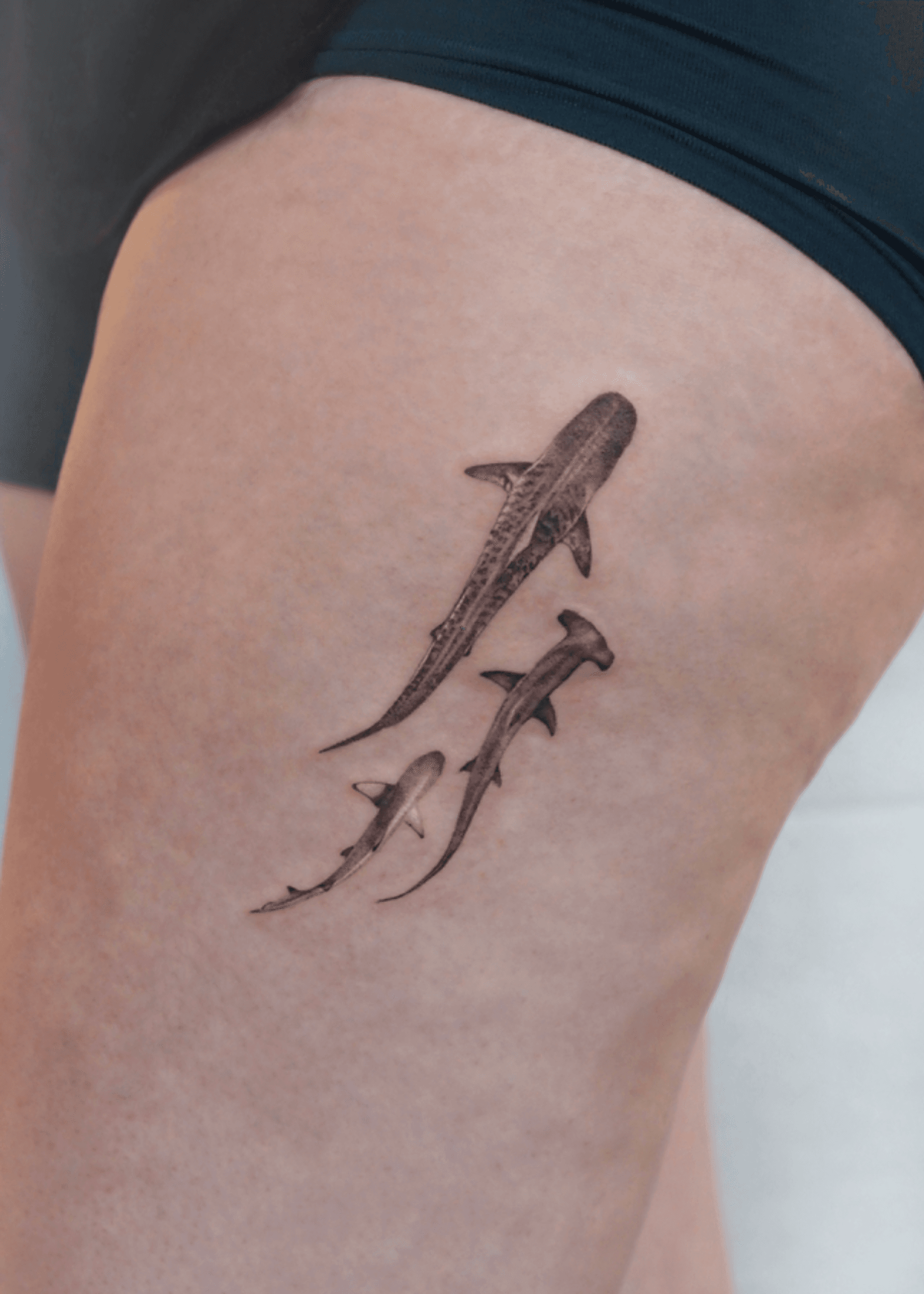 Tiger shark, hammerhead shark, and reef shark in a single composition in microrealism style #microrealism