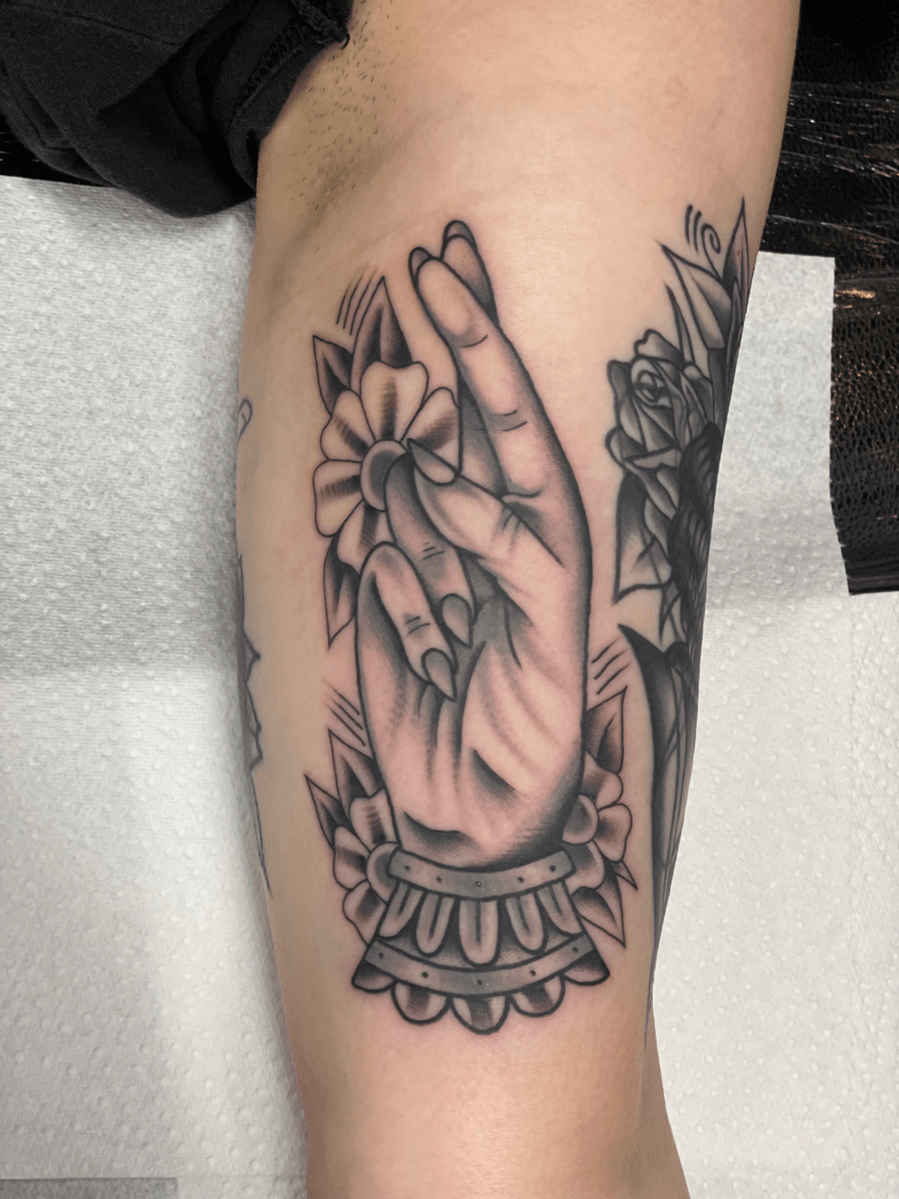 This tattoo is of a hand holding a flower, presented in a traditional tattoo style. The detail is enhanced by the use of shading and the flower's intricate pattern.