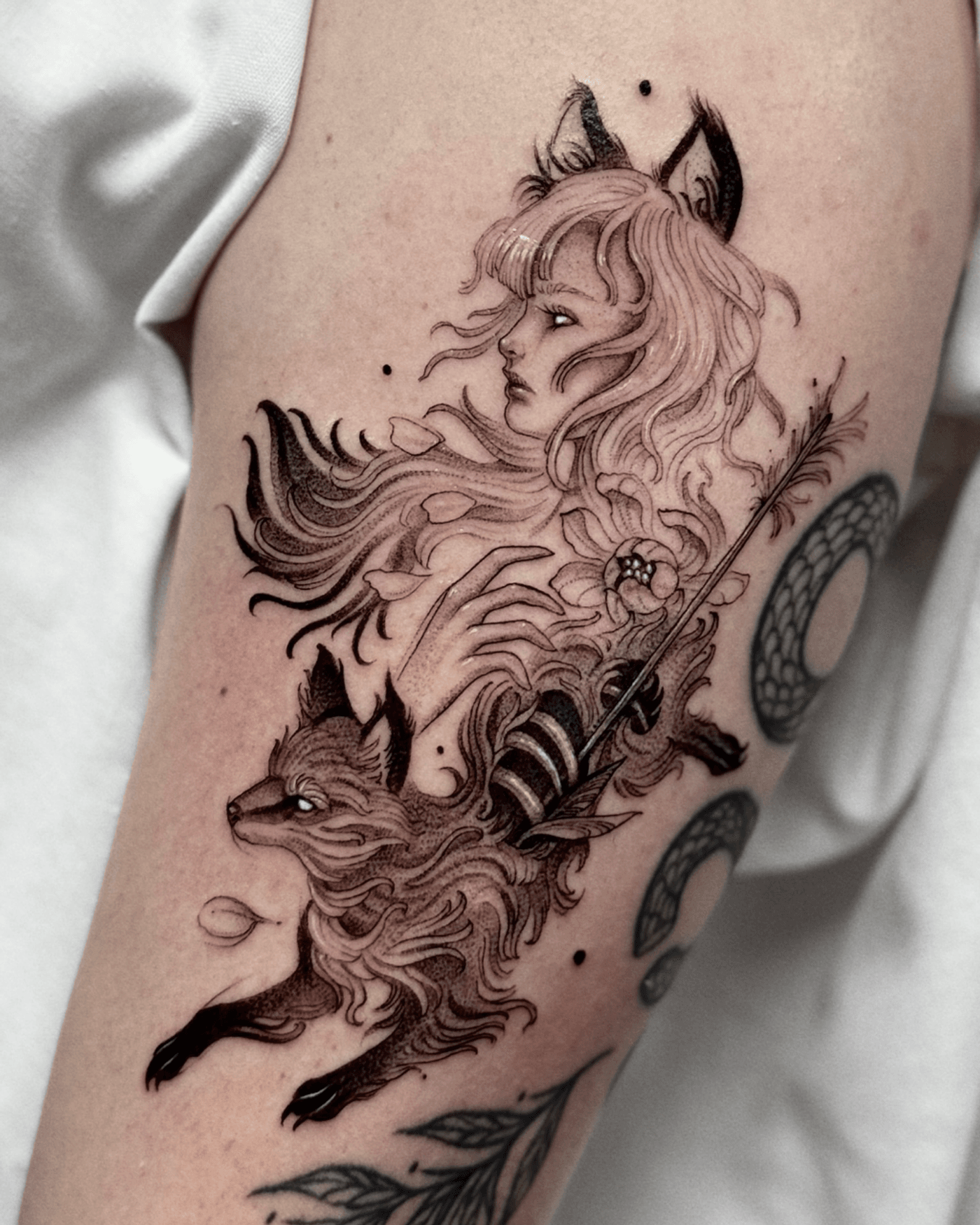 A tattoo showcasing a woman with fox ears, a fox, and an arrow. The style is fine-line, the technique is stippling, and the overall feel is magical.