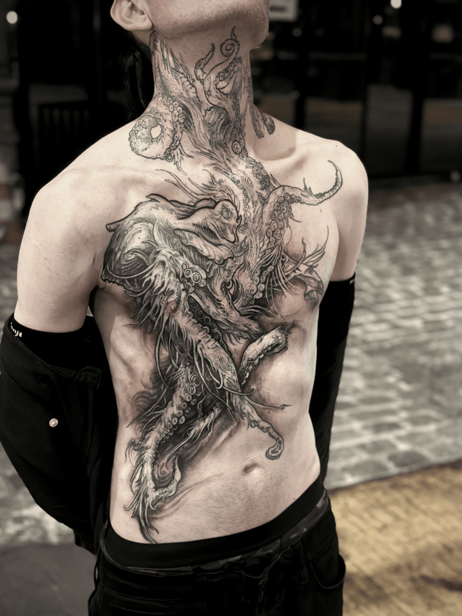 A detailed chest and neck tattoo depicting a large octopus with a stylized, almost ethereal design. The style is blackwork with fine line work, and shading. The overall feel is dark, intricate, and somewhat unsettling, with a sense of depth and movement.