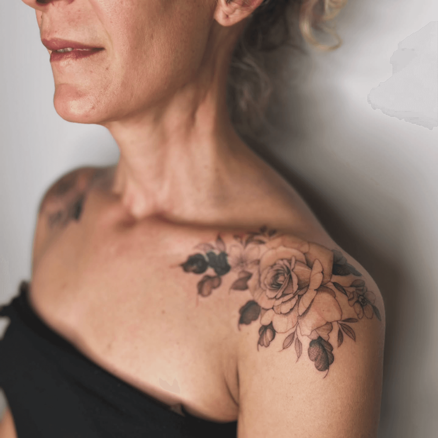 The tattoo is a rose and floral design on the shoulder. The style is realistic and detailed with a focus on shading. The overall feel is classic and timeless.