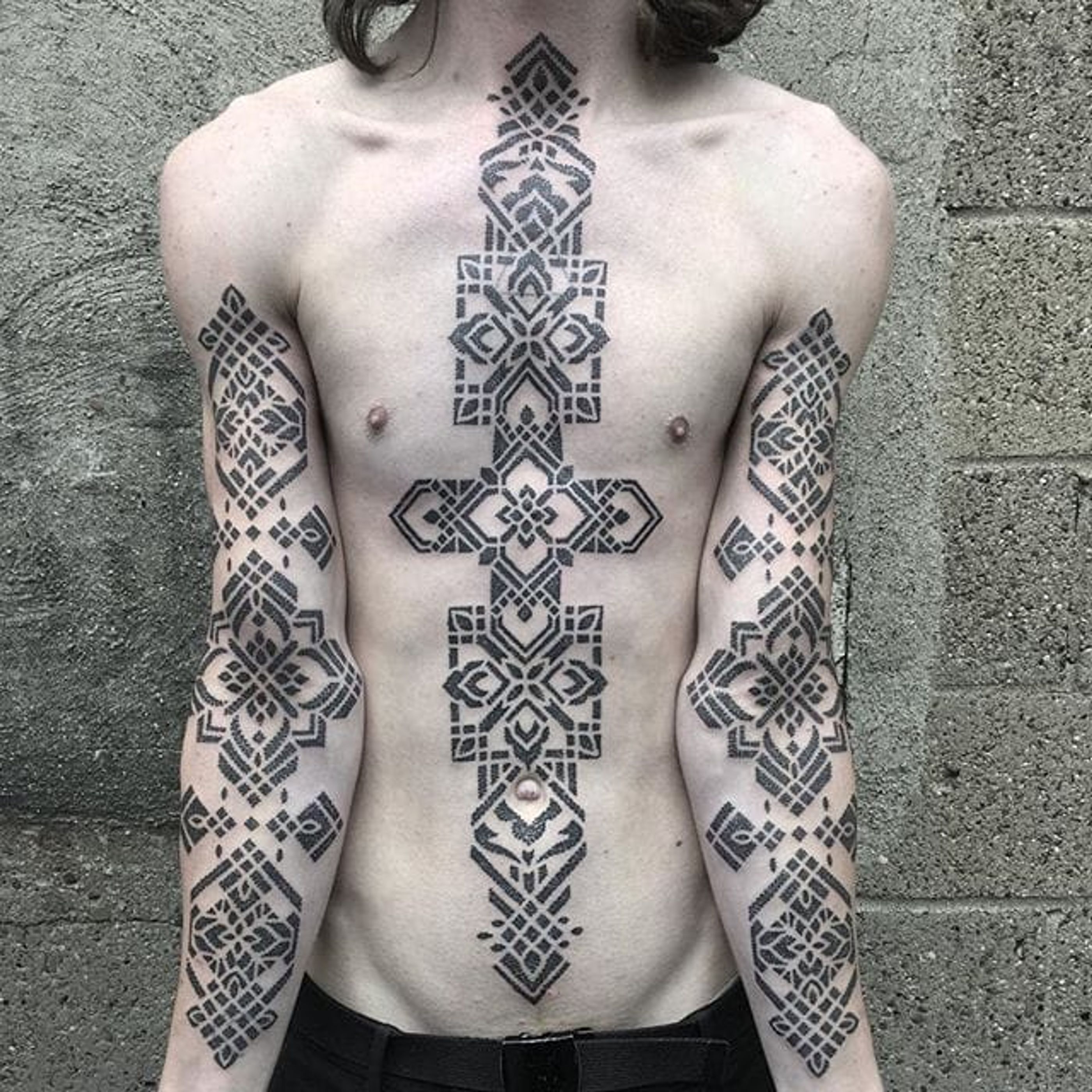 Excellent distribution of ornaments over the clients' body here. Really cool work by Nathan Mould. #arms #geometric #NathanMould #ornamental #sternum #stippled