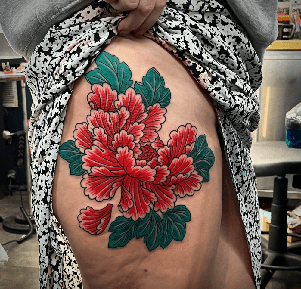 The tattoo features a vibrant red peony flower with green leaves, in a traditional Japanese style. The petals have a gradient shading effect, enhancing the depth and dimension. The overall feel is bold and visually striking.
