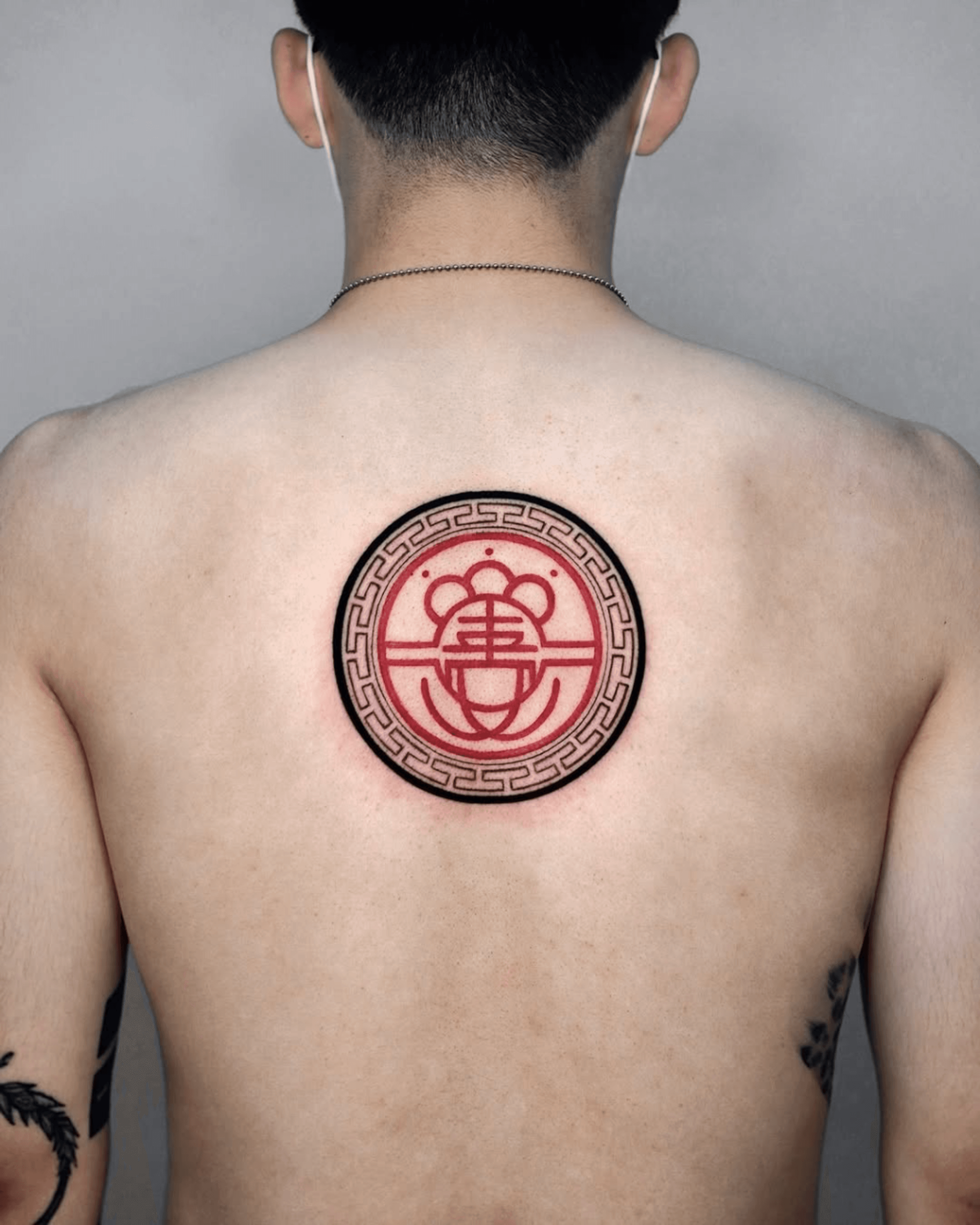 This tattoo is a design of a traditional Korean family name on a man's back. It features a traditional Asian design in red and black. The inner circle contains stylized characters surrounded by intricate patterns and concentric circles. The black outline creates a sharp contrast with the red elements.