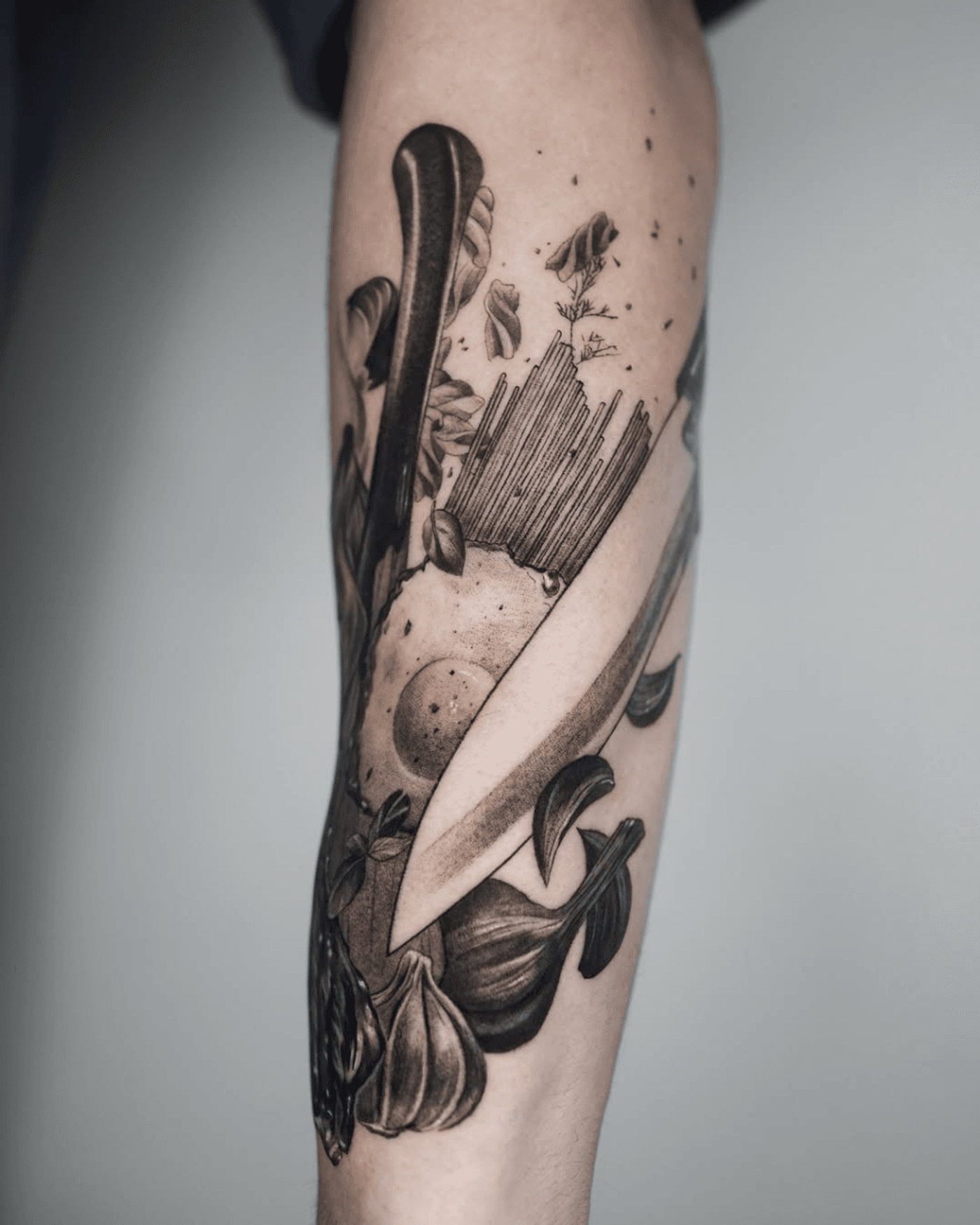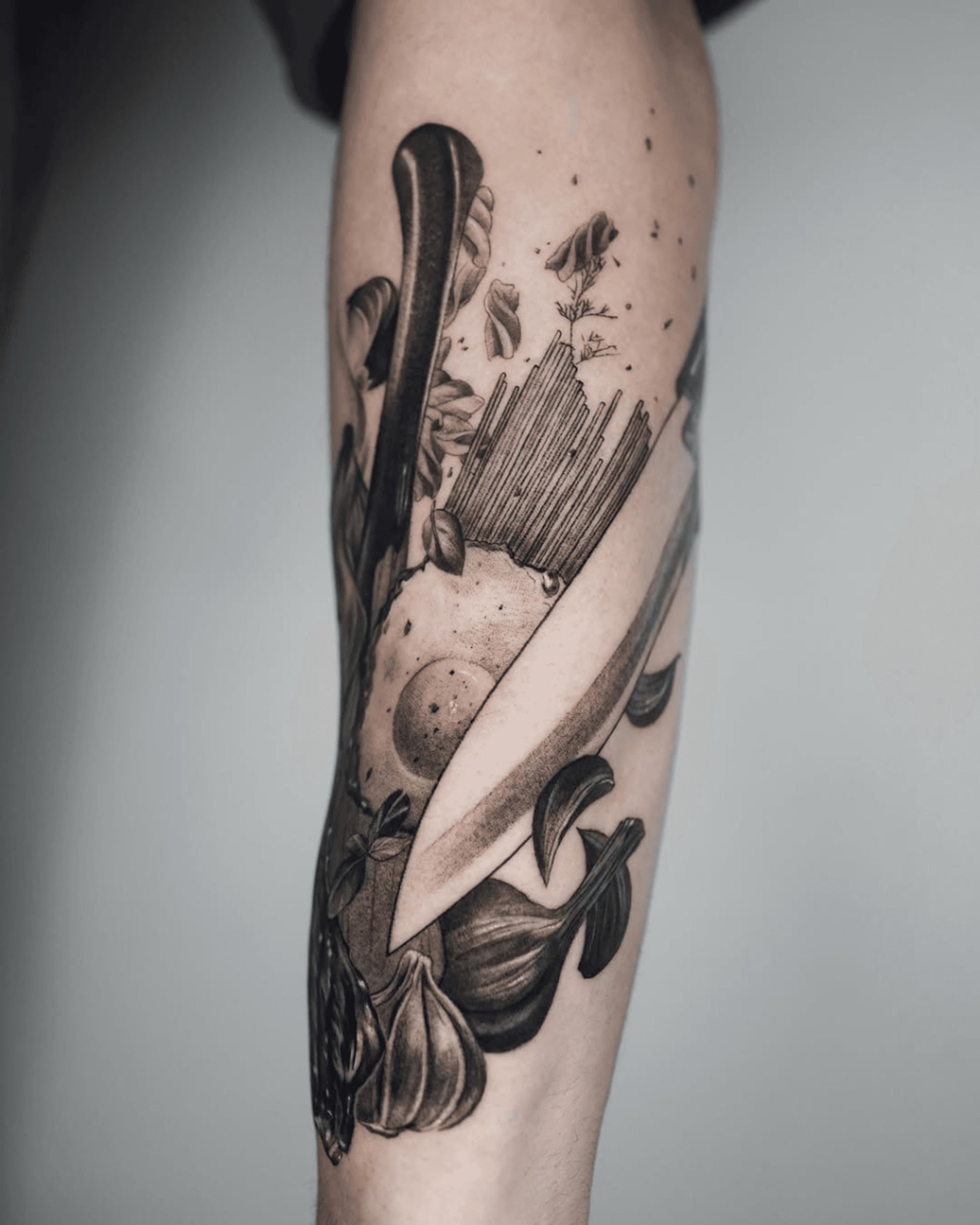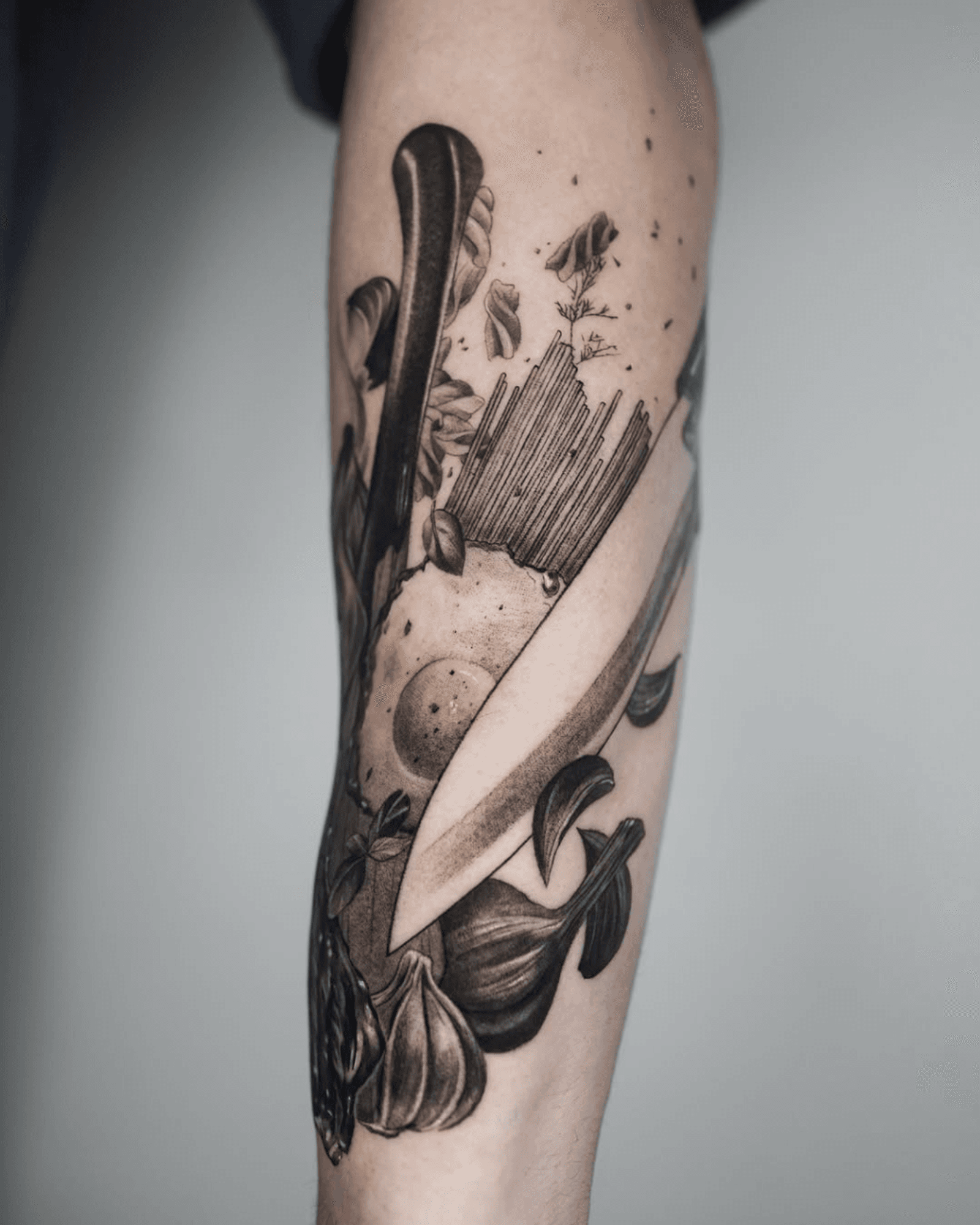 This tattoo is a realistic representation of a culinary still life for a chef at a restaurant, featuring a chef's knife, garlic, basil, pasta, and other ingredients that seem to explode from his forearm. It's a very detailed style that uses shading to create depth and dimension, giving it a dynamic and slightly chaotic feel.
