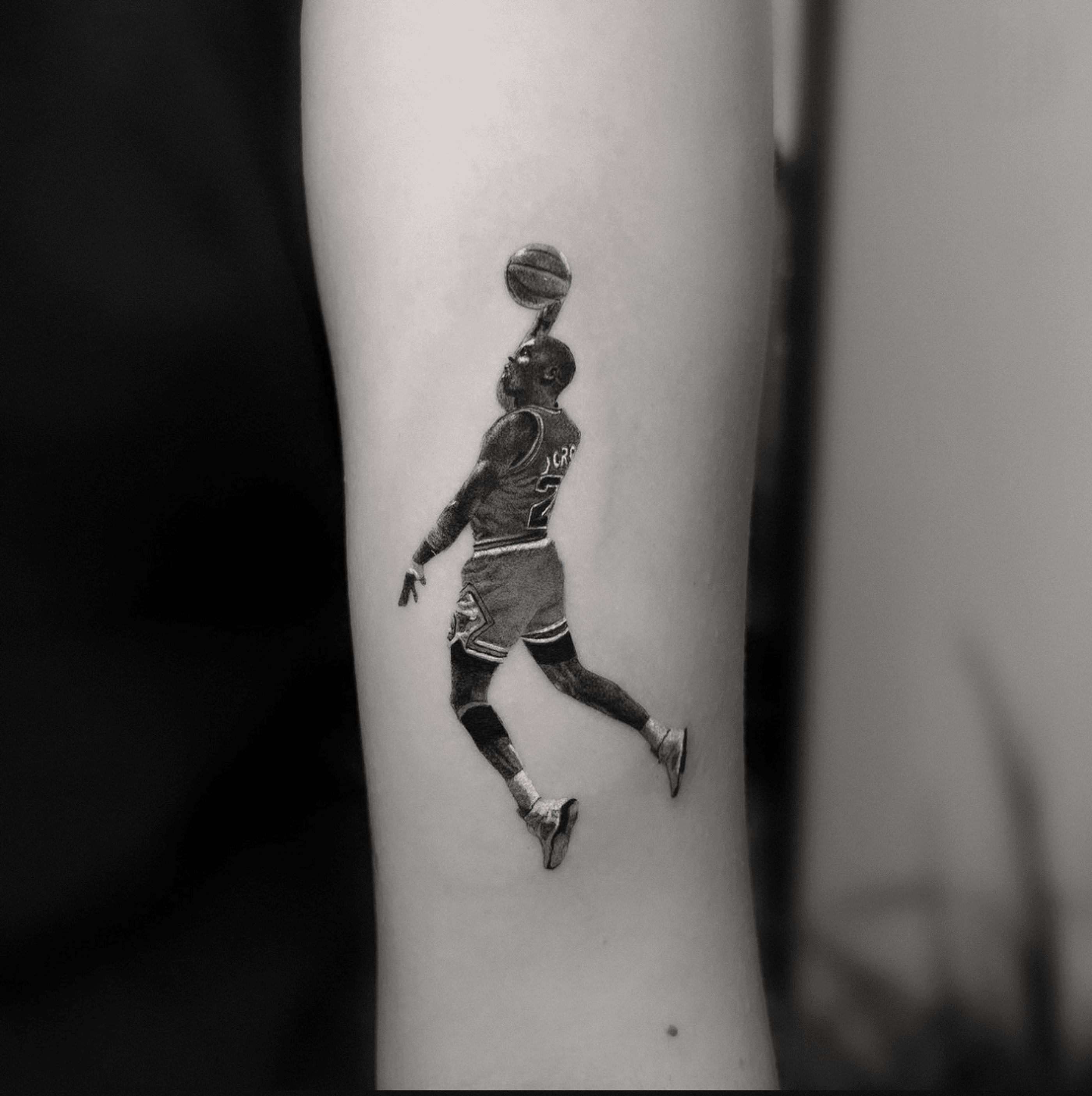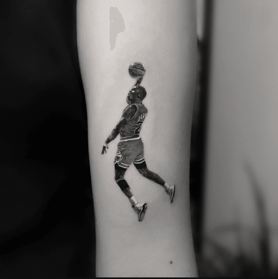 The tattoo is a realistic depiction of Michael Jordan in his iconic jump shot pose, balancing a basketball on his fingertips. It is rendered in grayscale, employing shading techniques to create depth and dimension. The tattoo captures the dynamism and movement of the action, creating a sense of energy and action.