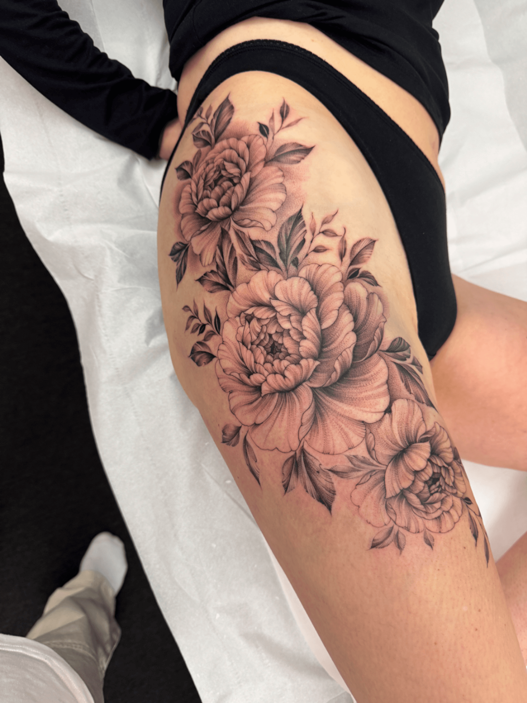 A realistic peony tattoo design with detailed shading and delicate linework. The tattoo showcases three peonies and leaves, with an elegant and artistic feel.
