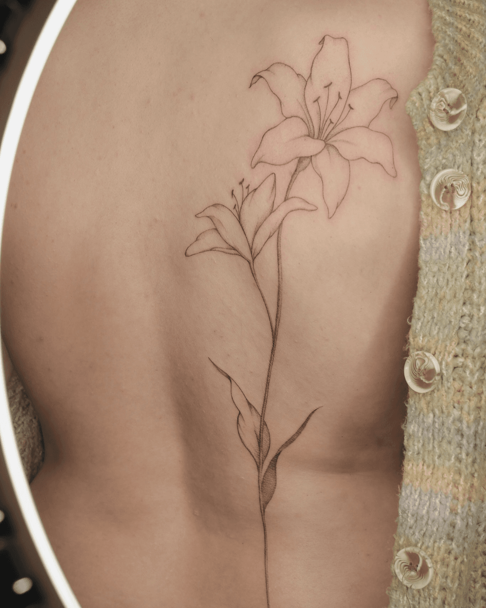 A lily flower tattoo, executed in fine line work. It features two lilies on a stem. The design creates a sense of simplicity.