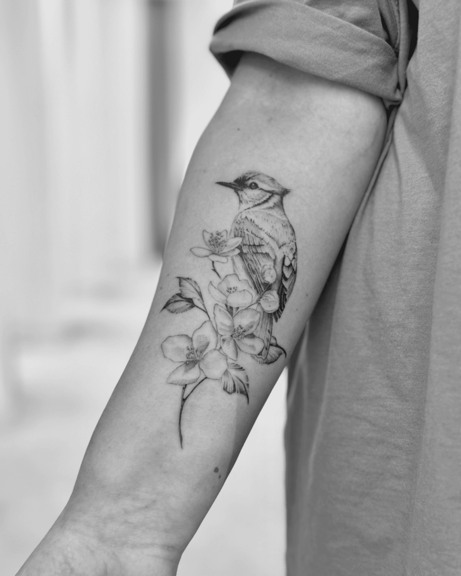 This tattoo features a blue jay perched on a branch adorned with white flowers. The bird and flowers are detailed with shading, giving them a realistic appearance. The style leans towards realism with a focus on fine lines.