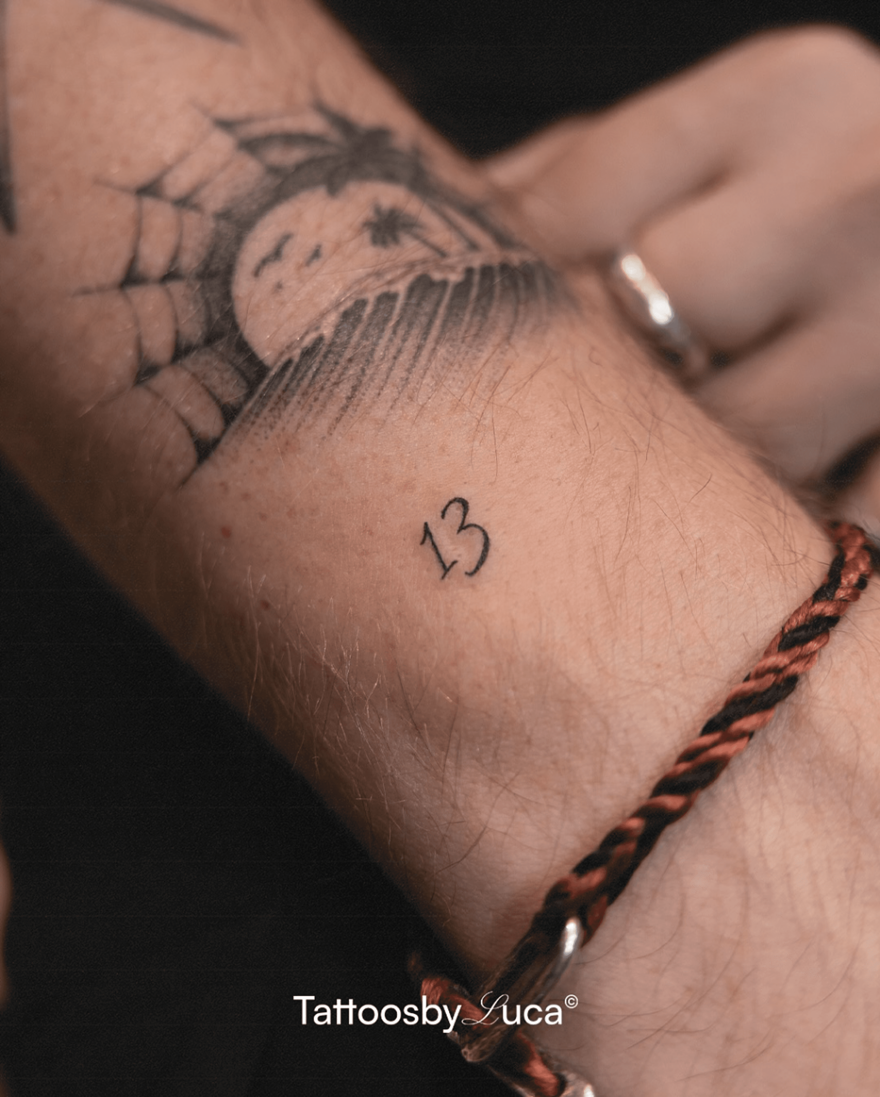 The tattoo presents the number 13 in a simple script. Above the number is a spiderweb with a moon. The design is minimalist, with the number appearing in fine lines. The overall feel is subtle, with a potential element of symbolism.