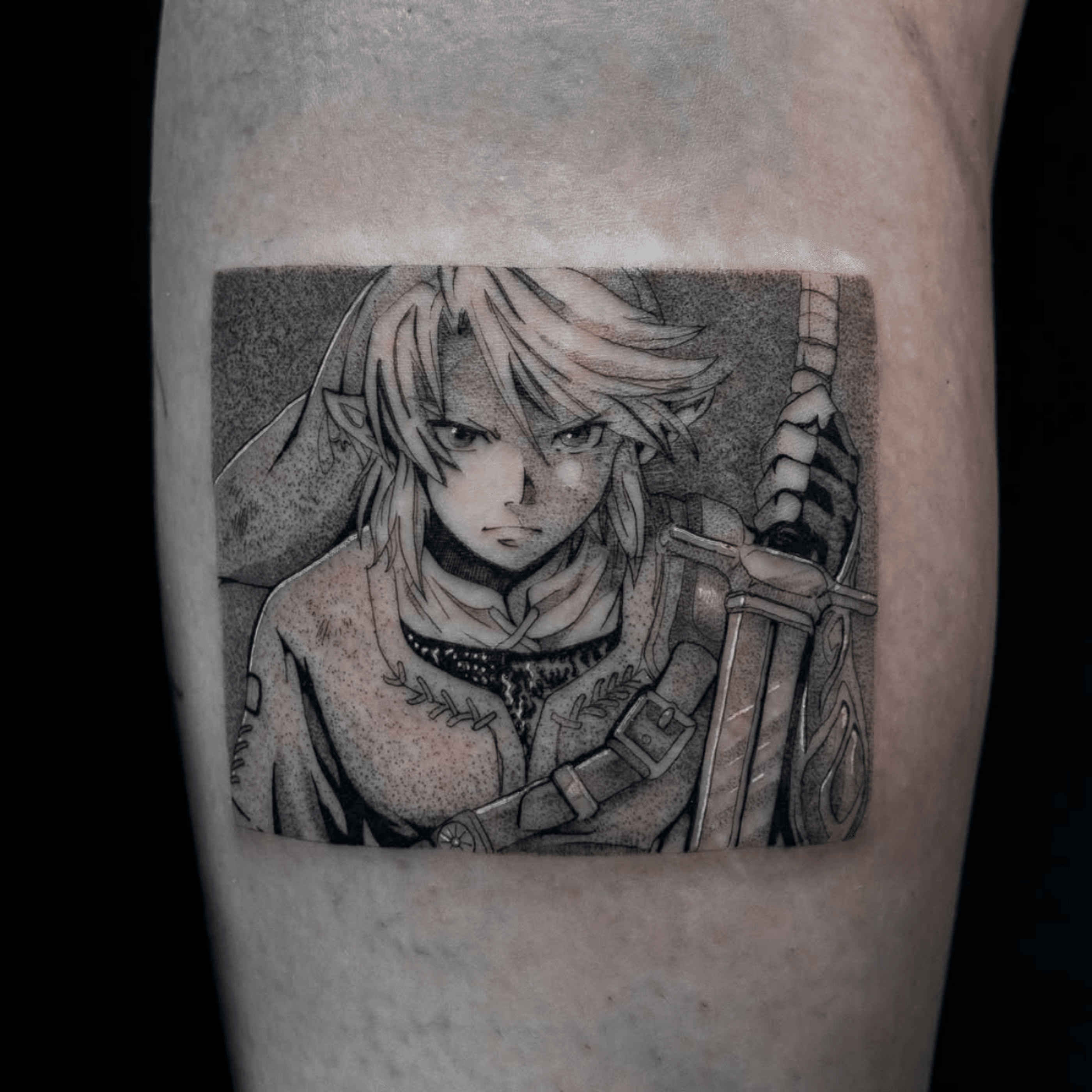 A black and grey tattoo of Link from The Legend of Zelda, done in a portrait style, showcasing detailed shading and linework to replicate the character.
