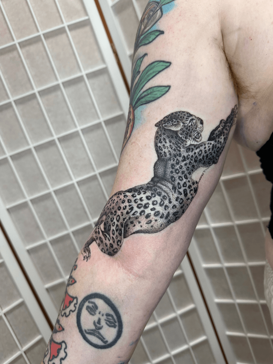 The tattoo depicts a jaguar in a dynamic pose, with detailed spots and muscular definition. The style appears to be realistic with stippling technique to achieve textures and shading. The overall feeling is of a powerful animal in motion.