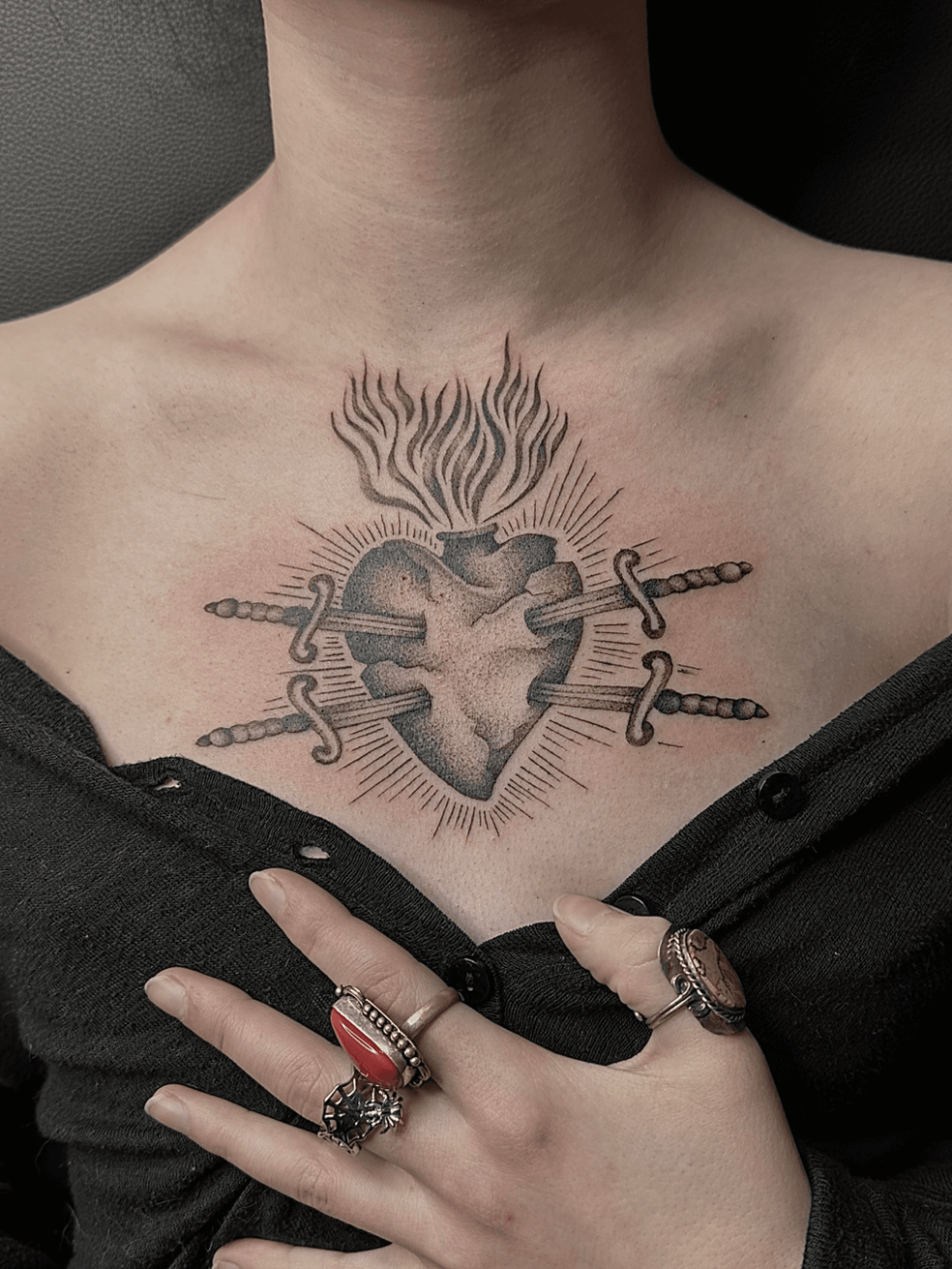 This tattoo is of a Sacred Heart pierced by four swords. The shading technique and line work create a textured effect and highlights details such as the heart's form and the blades. The overall feel of the tattoo is one of religious imagery and symbolism.
