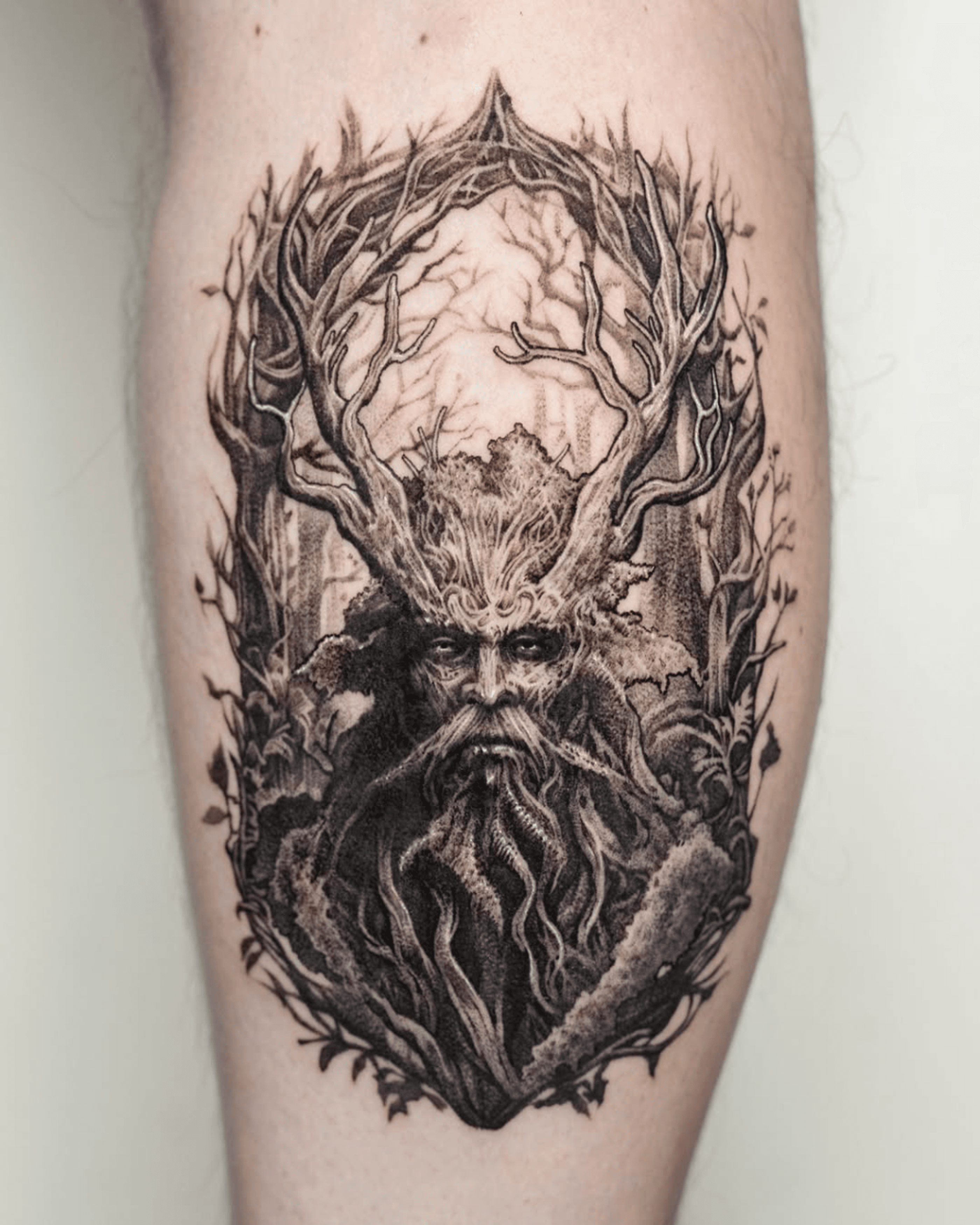 This tattoo is a design of the forest nymph Cernunnos. The style is illustrative and delicate, using careful shading to create depth and texture. It evokes feelings of nature, mythology, and fantasy.