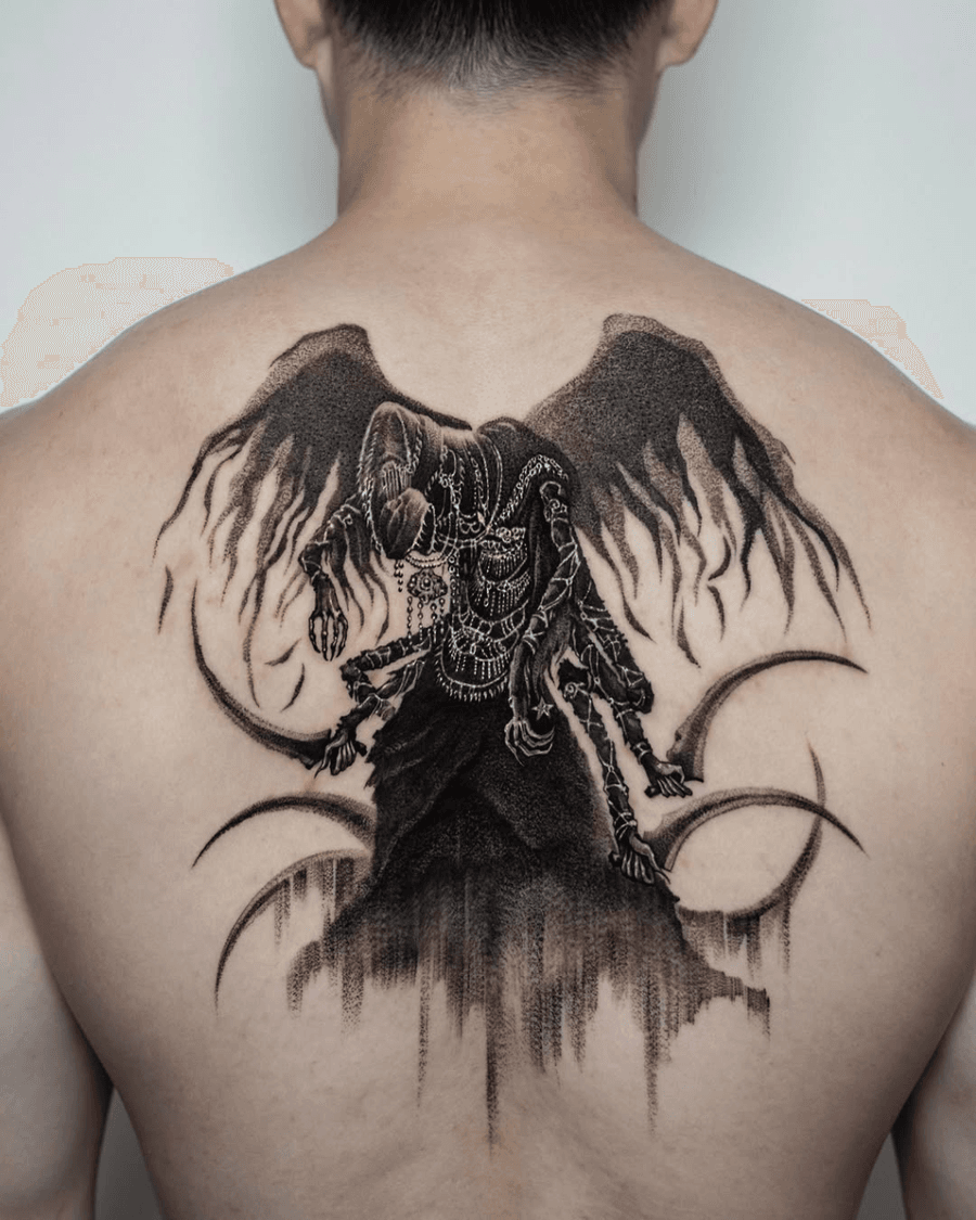 'Bloodborne:Mergo’s Wet Nurse' tattoo. The tattoo showcases a dark, creature-like figure with multiple limbs, wings, and a hooded form. The style leans towards a dark, illustrative aesthetic with extensive shading to build depth and a sense of mystery. The overall feel is ominous and somewhat otherworldly.