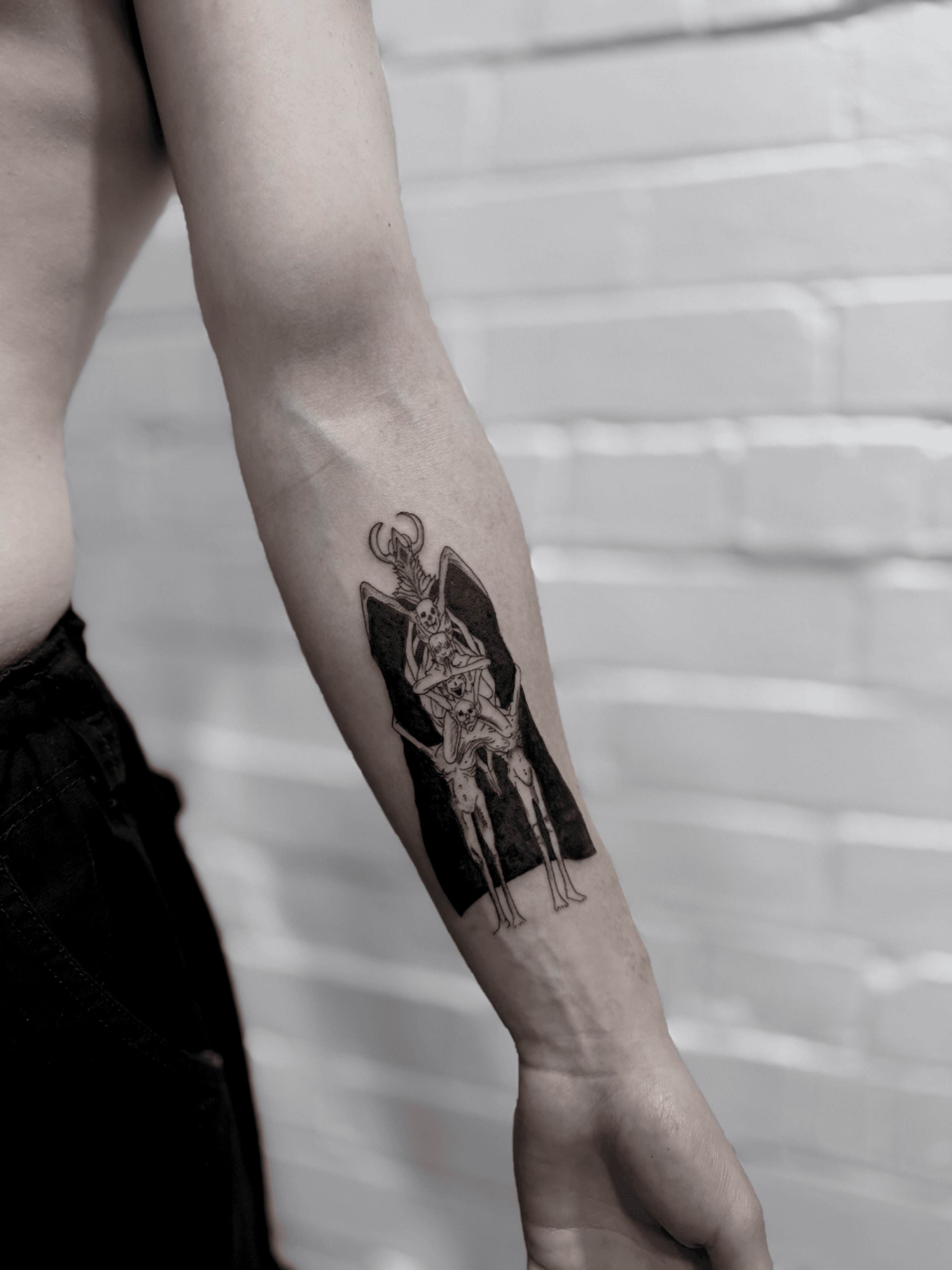 The tattoo depicts a skeletal or demonic figure with horns and a cape. The style is illustrative, using bold linework and shading, creating a striking, dark image. The design utilizes negative space effectively and has a gothic or surreal aesthetic.