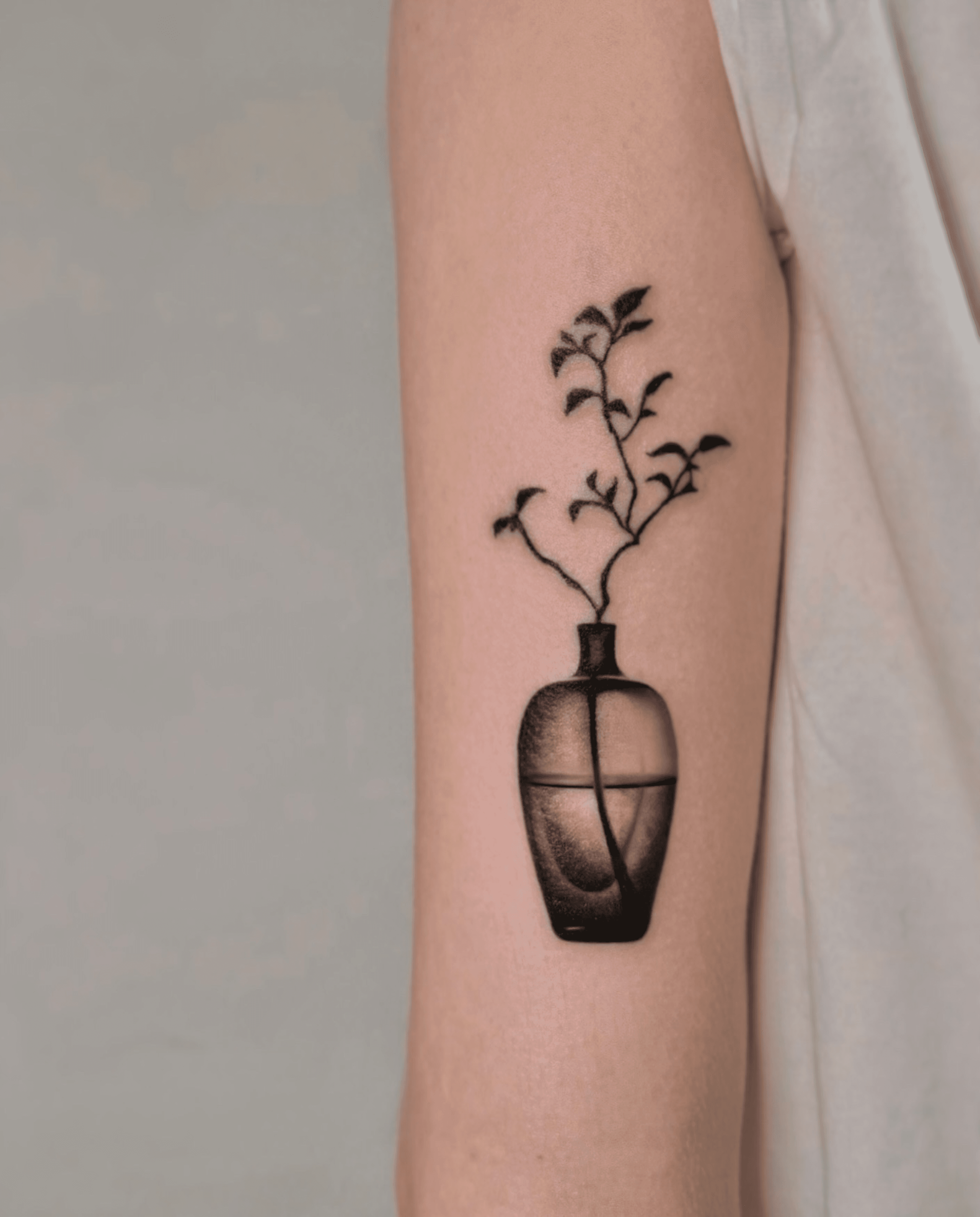 This tattoo depicts a vase with a plant inside. It's done in a minimalist, black-ink style, utilizing shading to give it depth and a realistic feel. The design conveys a sense of calm and simplicity.