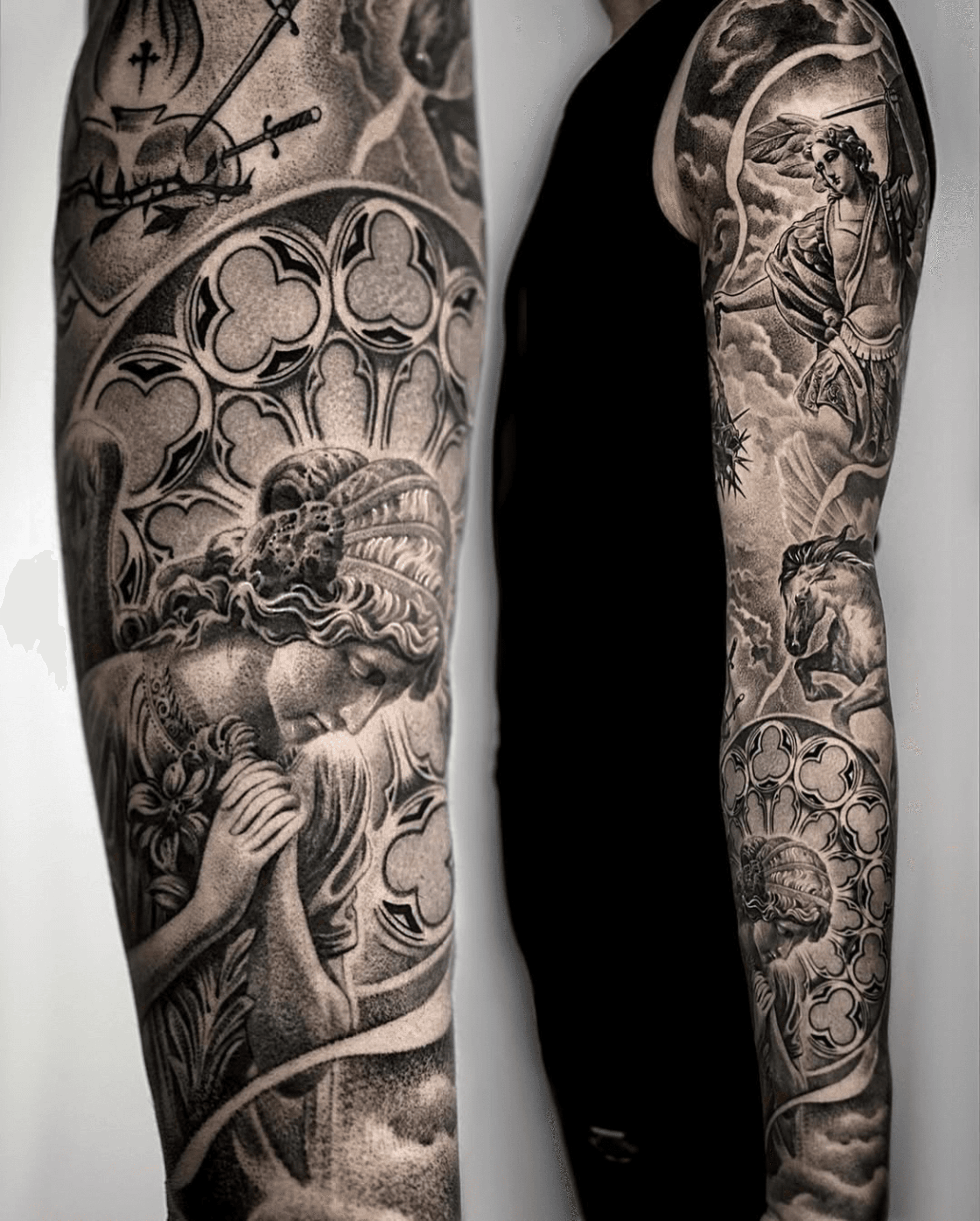 This tattoo features a delicate design in black and gray, composed of material from Greek mythology. It combines realistic figures with decorative elements. The shading and line work is very precise, giving it a three-dimensional effect.