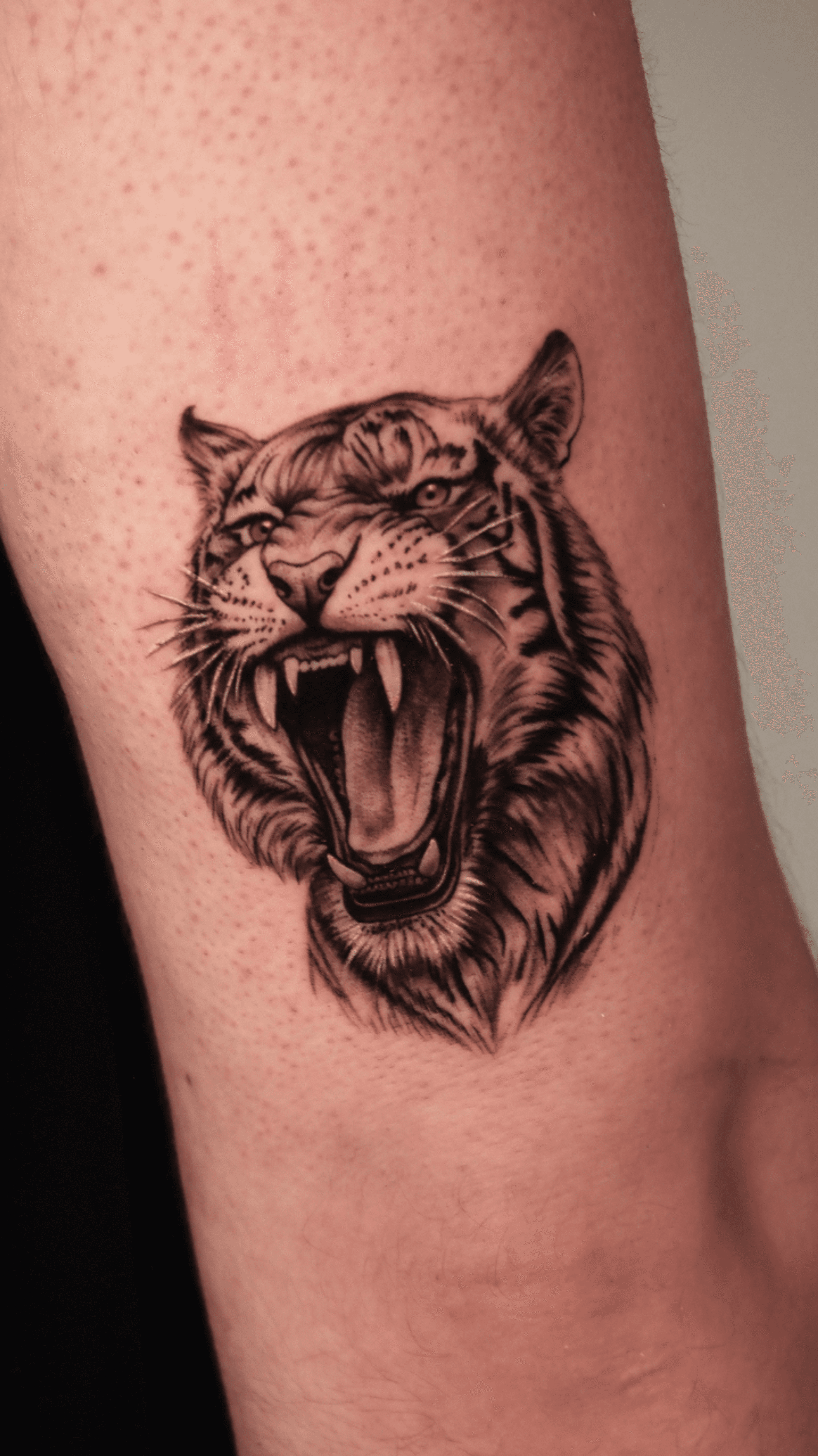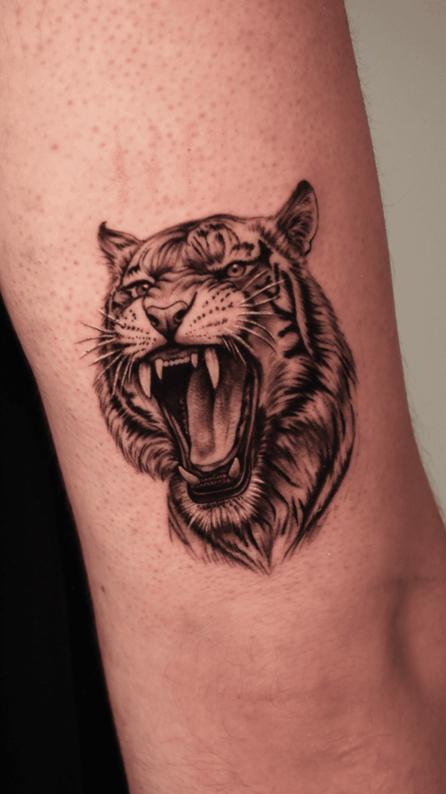 A black and grey micro realistic tattoo depicting a tiger with an open mouth and roaring expression. The tattoo features detailed shading to accentuate the ferocity.