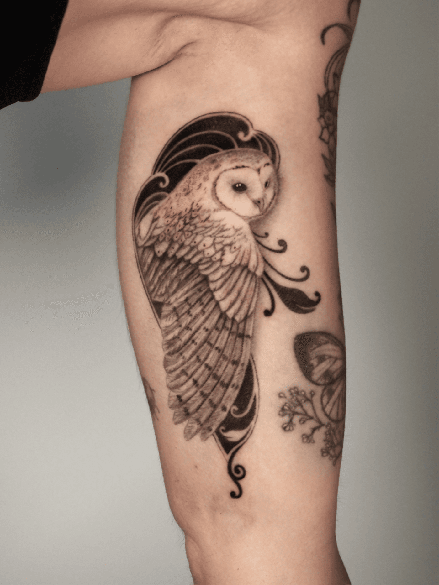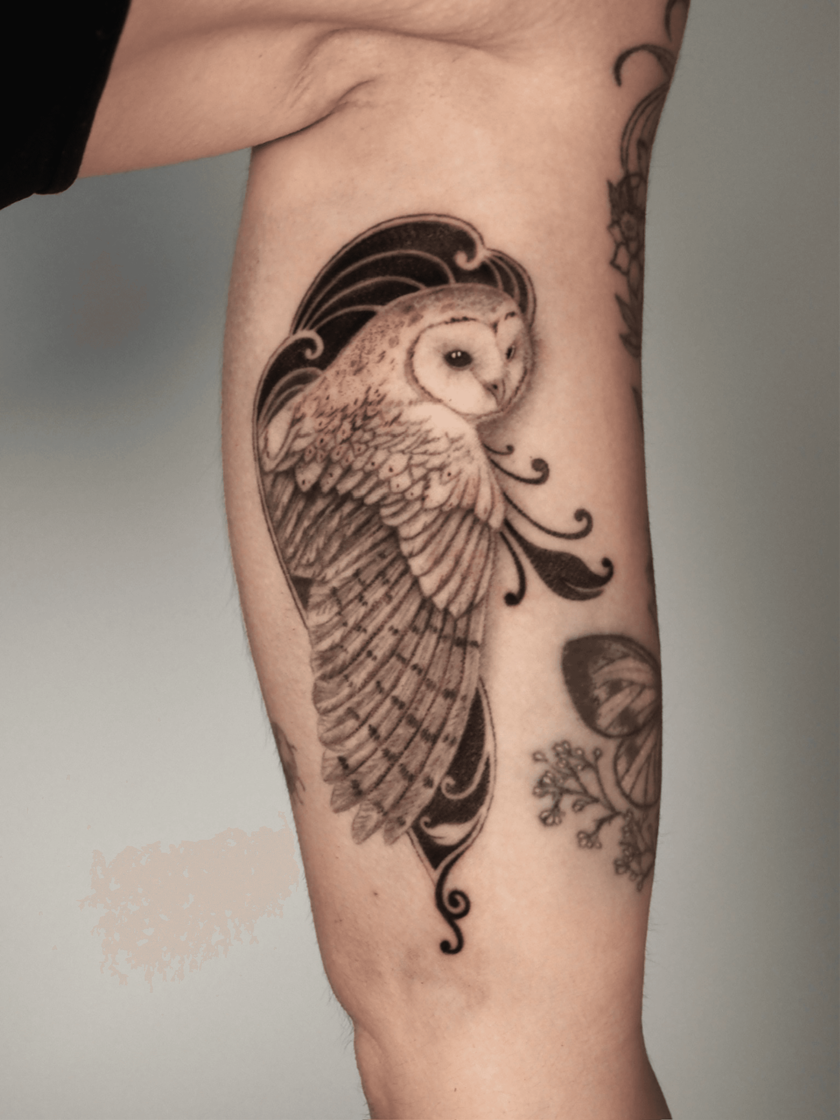 A black and grey micro realistic tattoo of an owl with a detailed wing and feather patterns set against a decorative, ornamental backdrop. The style uses detailed shading to create depth and a realistic feel.