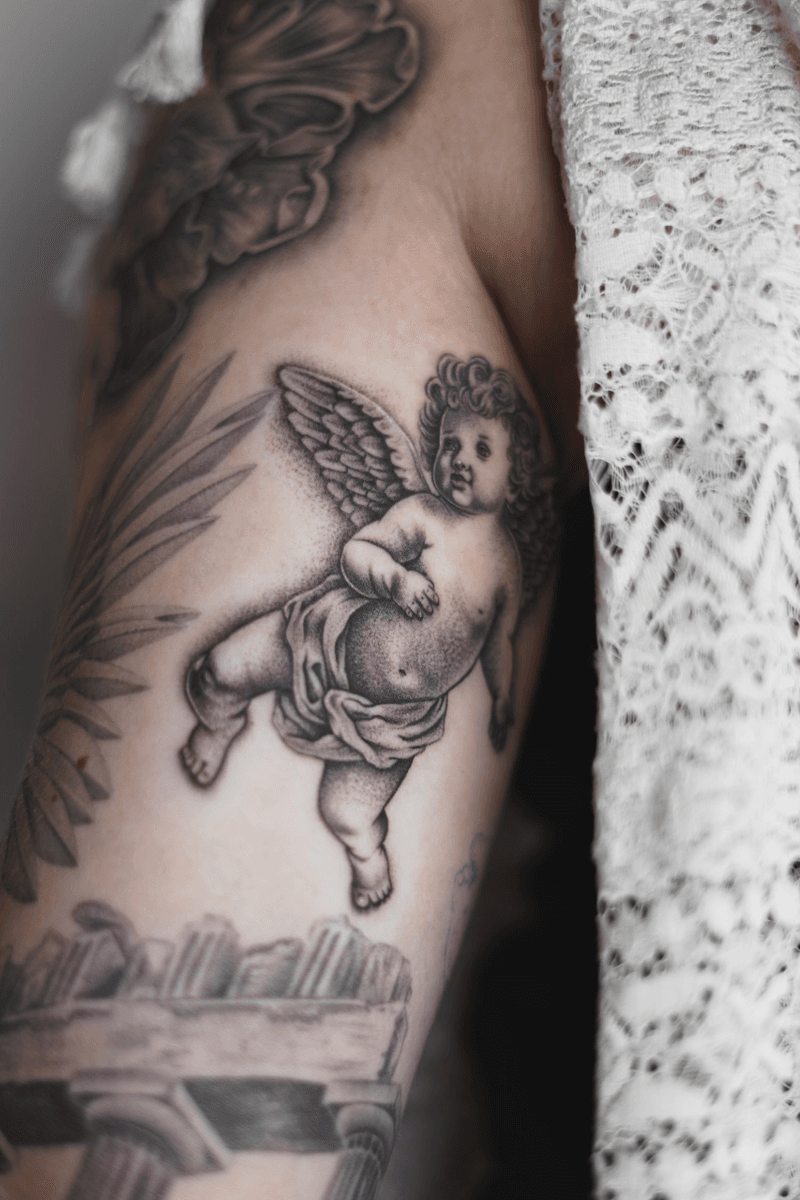 This tattoo shows a black and grey realistic cherub angel in a dynamic pose. The style has a classical feel, the grayscale shading adds depth, and the detailing conveys a sense of movement.