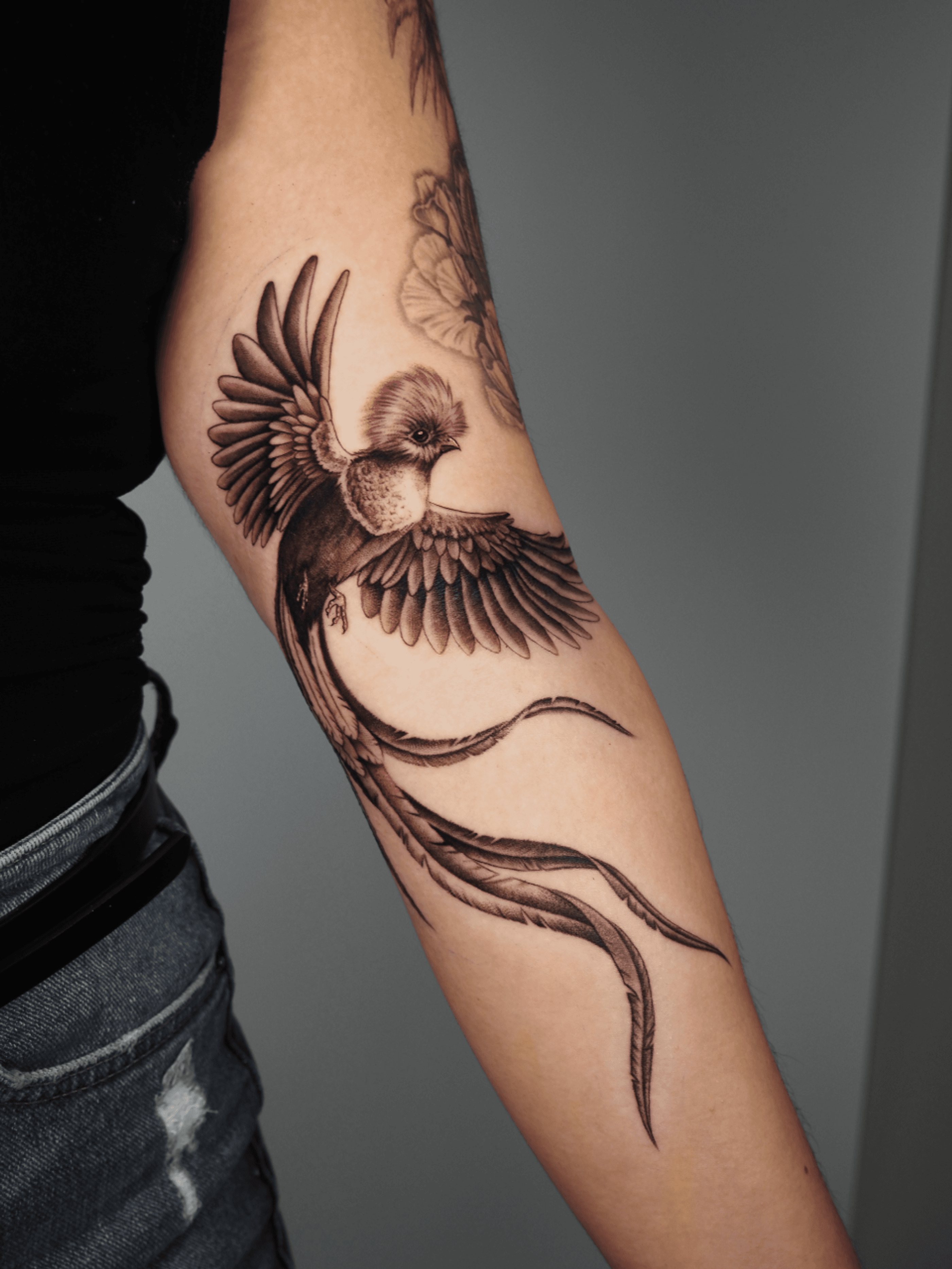 The tattoo depicts a Quetzal bird in flight with extended wings and long tail feathers. The style is detailed and illustrative, with shading that creates a sense of movement and depth. The overall feel is graceful and dynamic.