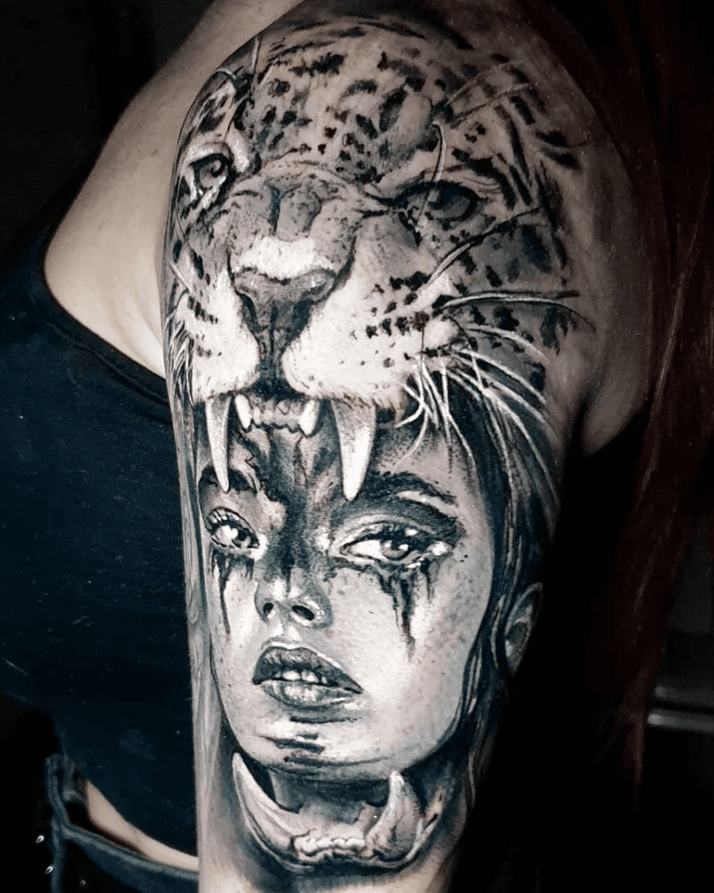 This tattoo is a black and gray portrait of a woman with a fierce appearance, wearing a jaguar headdress. The shading is skillfully done, with detailed shading and contrasting light and dark values, creating a realistic and striking aesthetic.