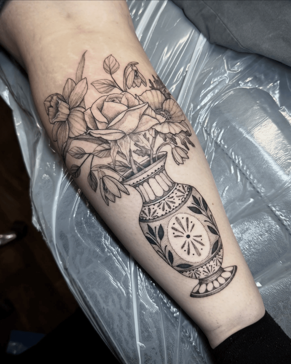 The tattoo is of a vase with flowers. The style is illustrative, using fine lines and shading to convey texture and depth. The overall feel is elegant and detailed.